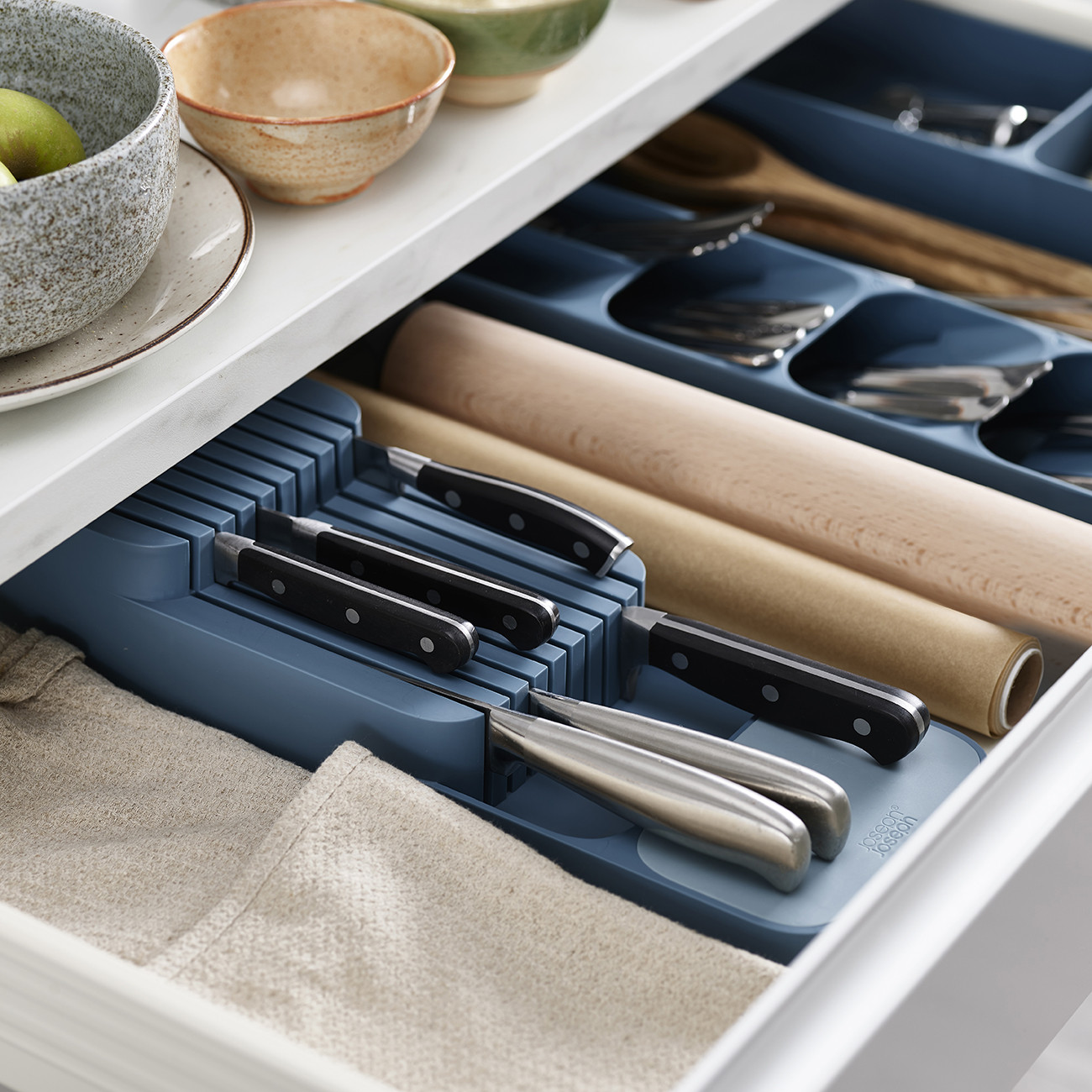 Органайзера за ножове DrawerStore ™  на английската компания Joseph Joseph спестява място в чекмеджето за прибори, като съхранява ножовете ви на две нива и ги държи безопасно на сигурно място.