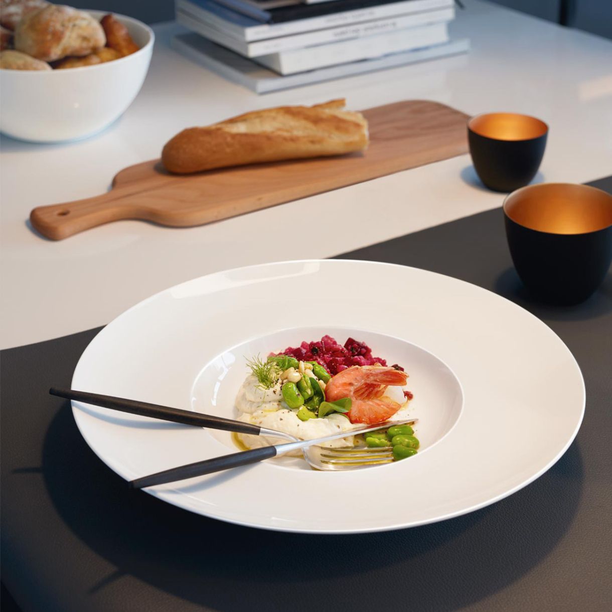 Голяма гурме чиния за стилно сервиране на вашата храна. Истинска радост за окото. Тази чиния ви предлага идеалната обстановка за благородна вечеря сред приятели. Гурме чинията е от колекция à table и е с диаметър 29см. À table е колекция с вечен дизайн и семпли форми, както и висококачествена изработка от фин костен порцелан.
