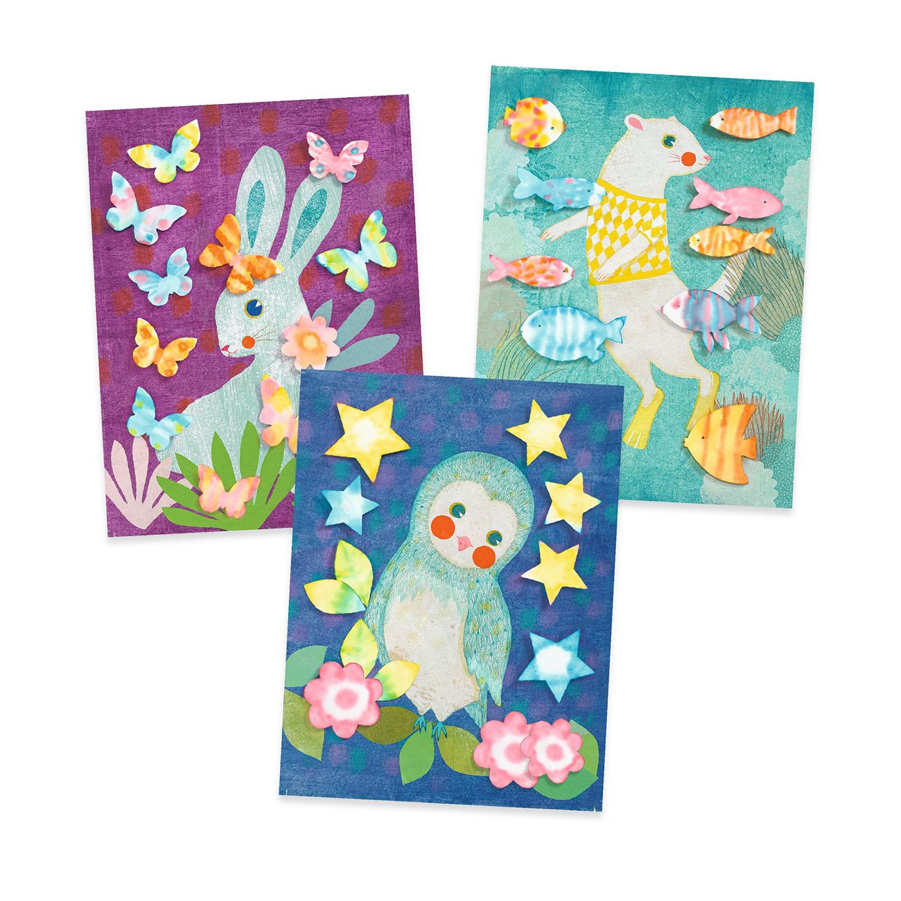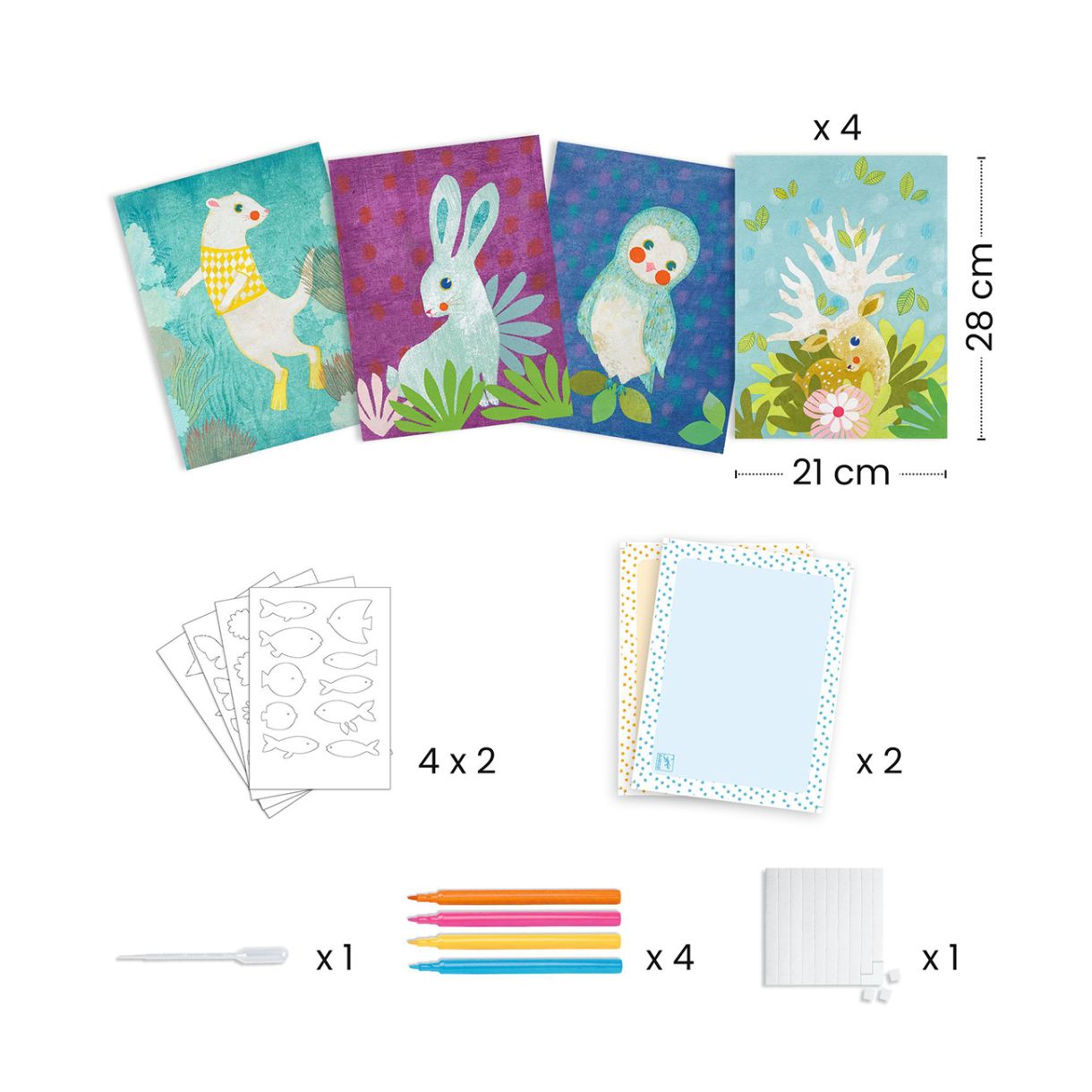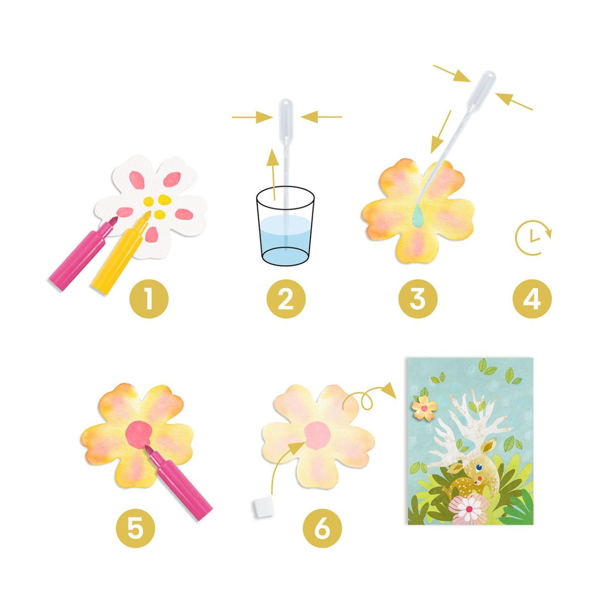 Изцяло ново ранно изживяване за възраст над 3 години. Откъснете фигура от попивателната хартия и я поставете върху абсорбиращата хартия. Направете няколко точки с писалката и добавете капка вода с помощта на пипетата: Мастилото ще започне да се разпространява... Резултатите са невероятни! След като рисунката изсъхне, използвайте двойнозалепваща лента, за да я залепите върху илюстрираните фонове и да украсите стаята си.