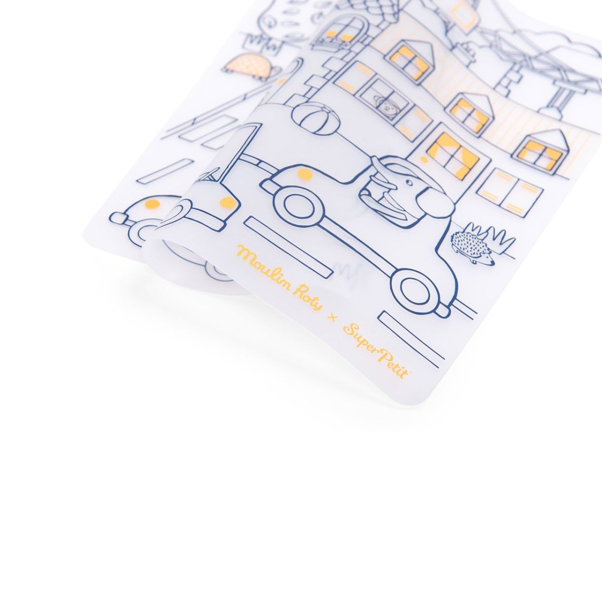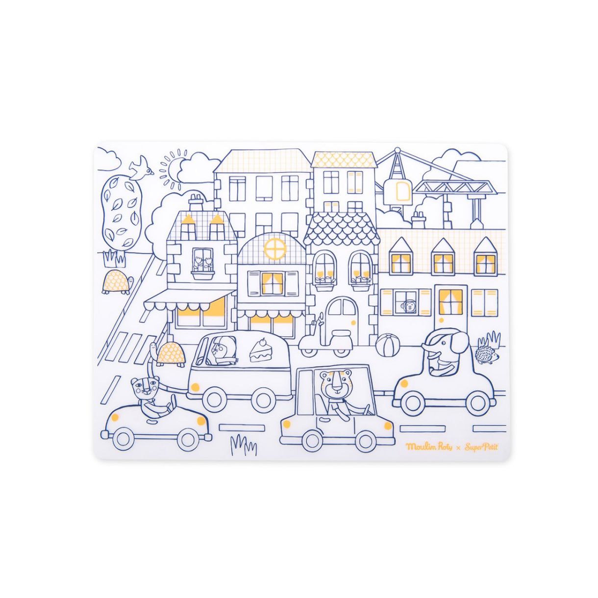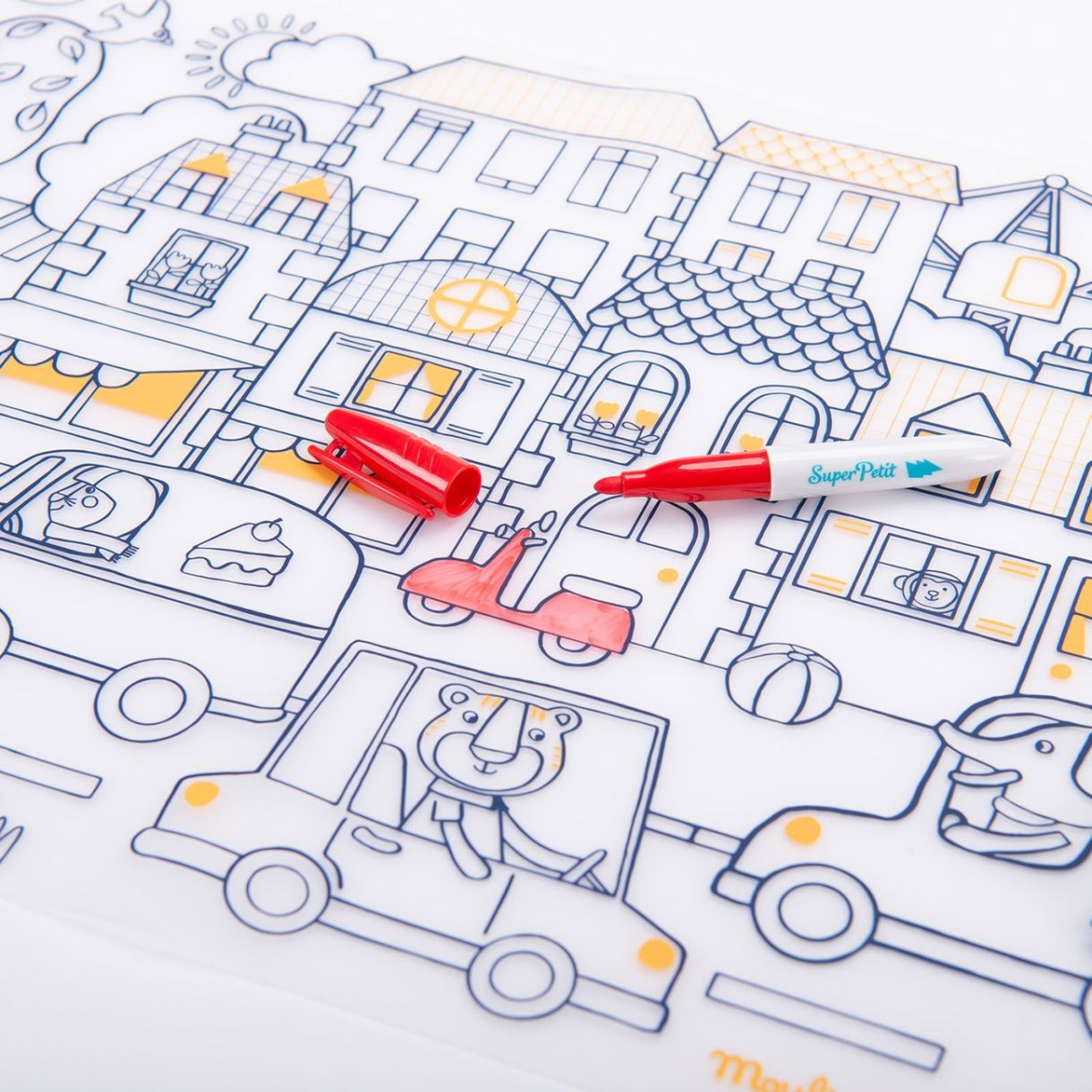 Силиконова подложка за оцветяване създадена в сътрудничество със Super Petit! Споделяйте забавни семейни моменти по време на оживени, творчески ястия... Състои се от комплект, който може да се използва отново и отново, и 5 изтриваеми маркера. Почистете със суха или влажна кърпа.