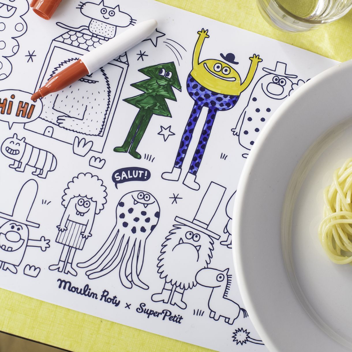 Силиконова подложка за оцветяване  създадена в сътрудничество със Super Petit! Едната страна е за оцветяване по илюстрация от колекцията „Днес е сряда“, а другата страна е за свободно рисуване. Лесен за пренасяне и почистване!