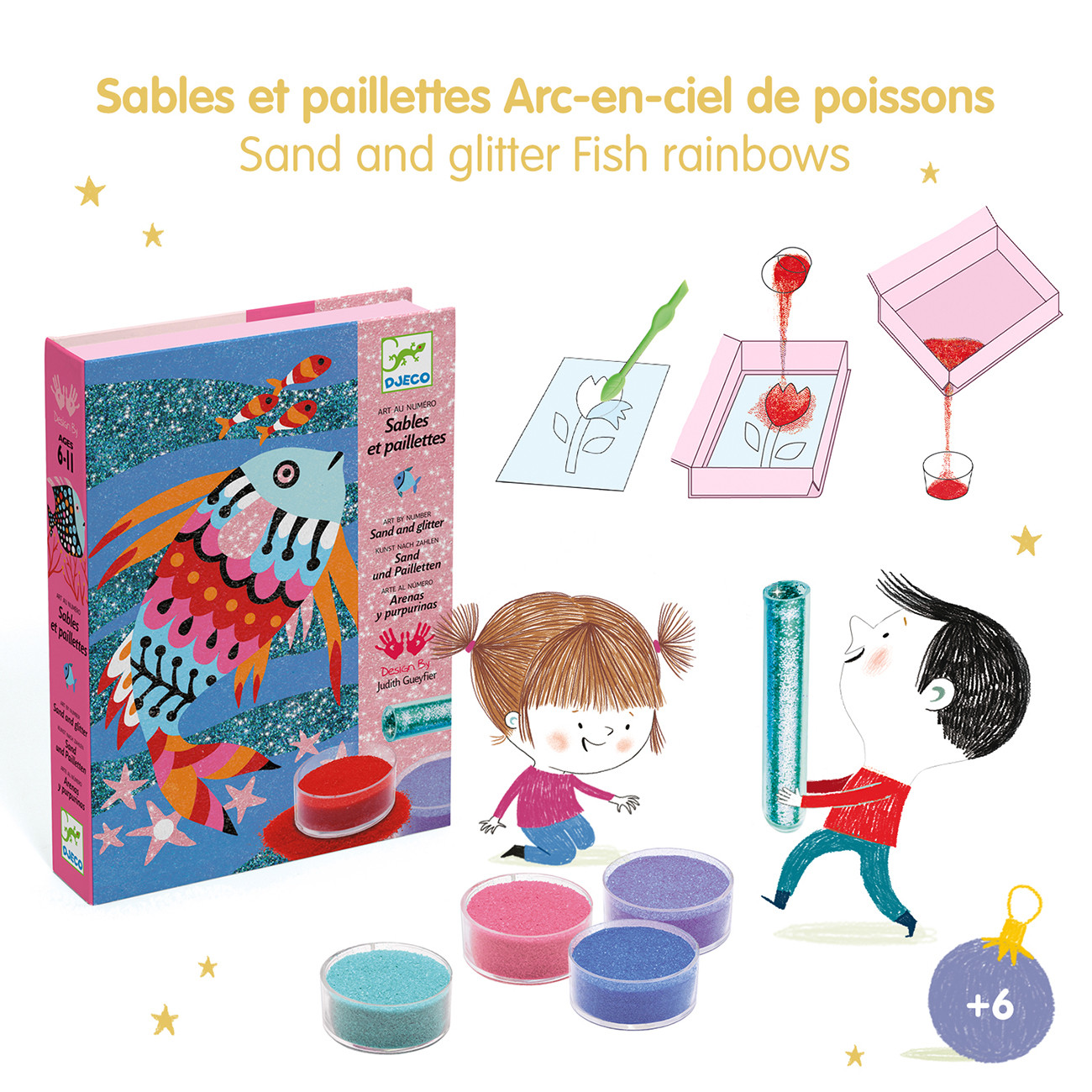 4 картини на тема рибки, които да озарите с цветен пясък и блясък. Децата поставят картината в кутията, използват предоставения инструмент, за да изложат предварително залепените области и поръсват цветния пясък и блясъка, следвайки цветно кодираните инструкции. След като са готови, цветовете на снимките се разкриват и рибите блестят и блестят!