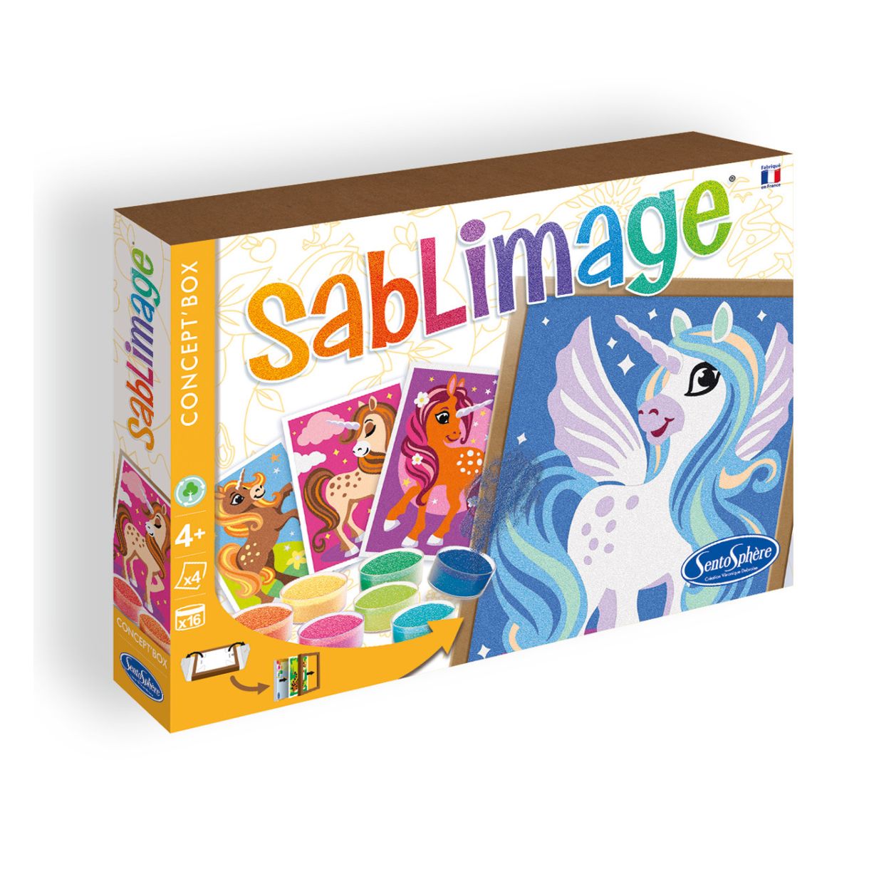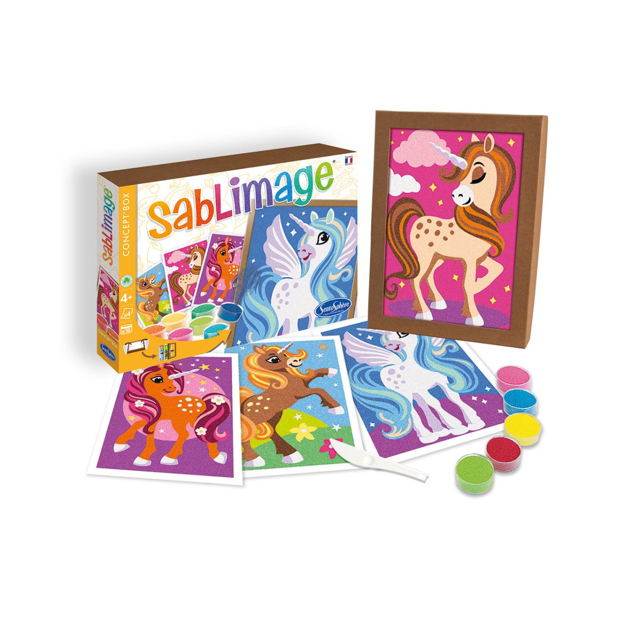 Създай красиви картини с помощта на цветен пясък от серията оцвети с пясък на френската фирма Sentosphere. Тази забавна активност е проектирана така, че децата да се забавляват и създават красиви картини без да цапат и замърсяват вкъщи. За целта просто трябва да отлепите предпазните безцветни лепенки и да оставите детето да създаде своя феерична картинка с различните цветове пясъци.