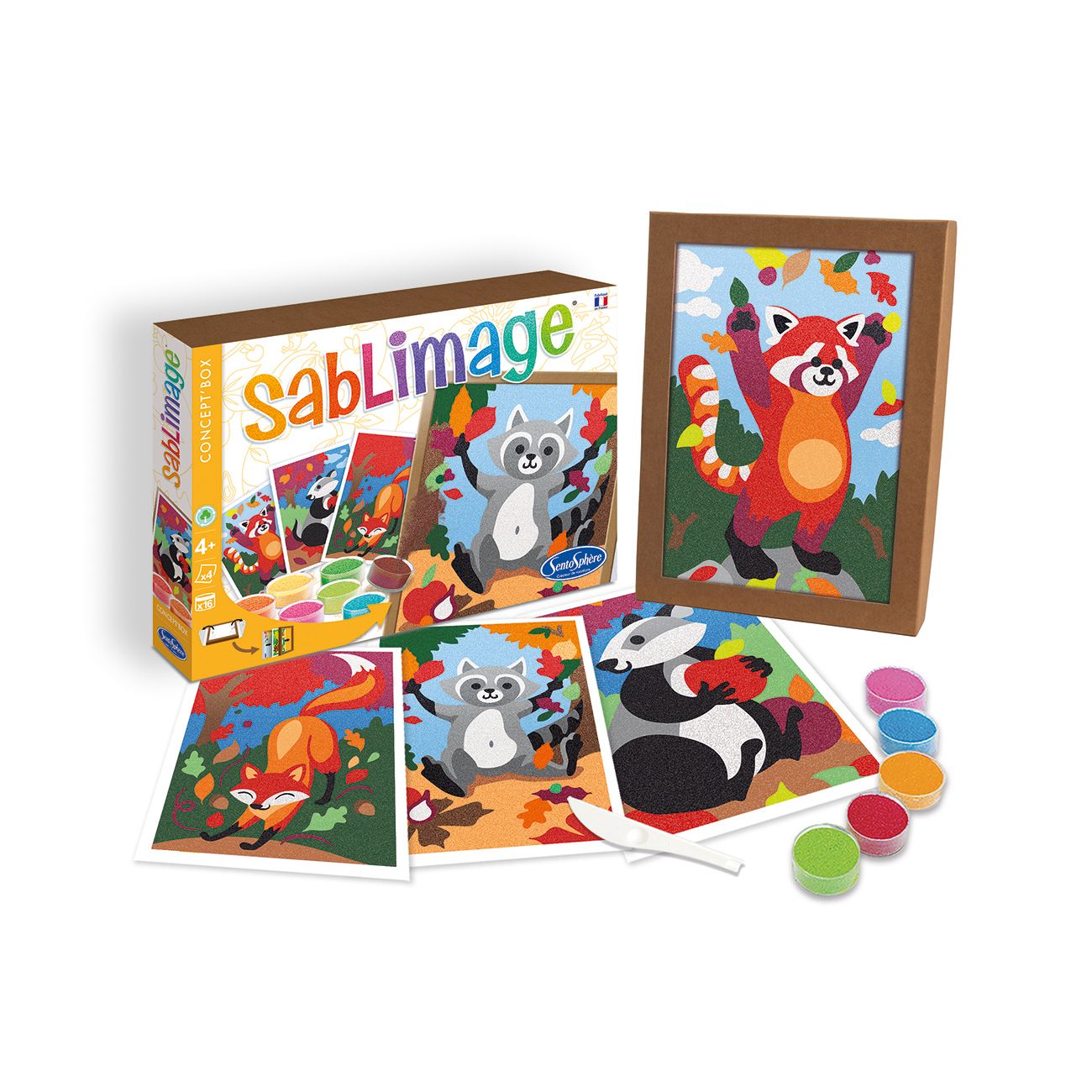 Създай красиви картини с помощта на цветен пясък от серията оцвети с пясък на френската фирма Sentosphere. Тази забавна активност е проектирана така, че децата да се забавляват и създават красиви картини без да цапат и замърсяват вкъщи. За целта просто трябва да отлепите предпазните безцветни лепенки и да оставите детето да създаде своя феерична картинка с различните цветове пясъци.