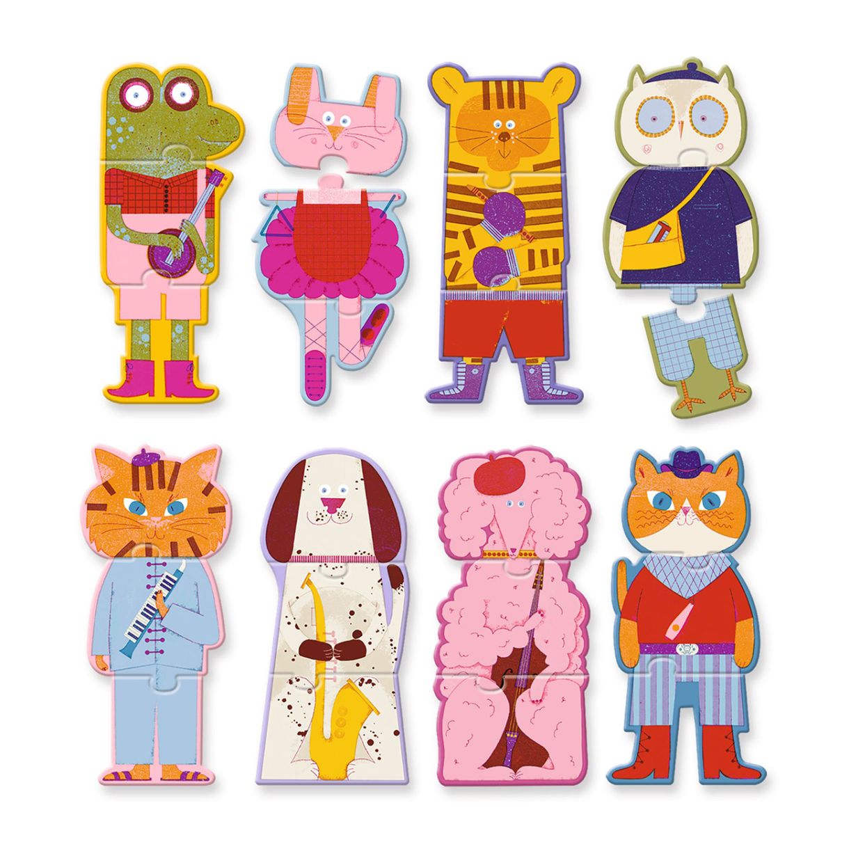 • 8 вертикални пъзела, всеки с 3 силуетни части.