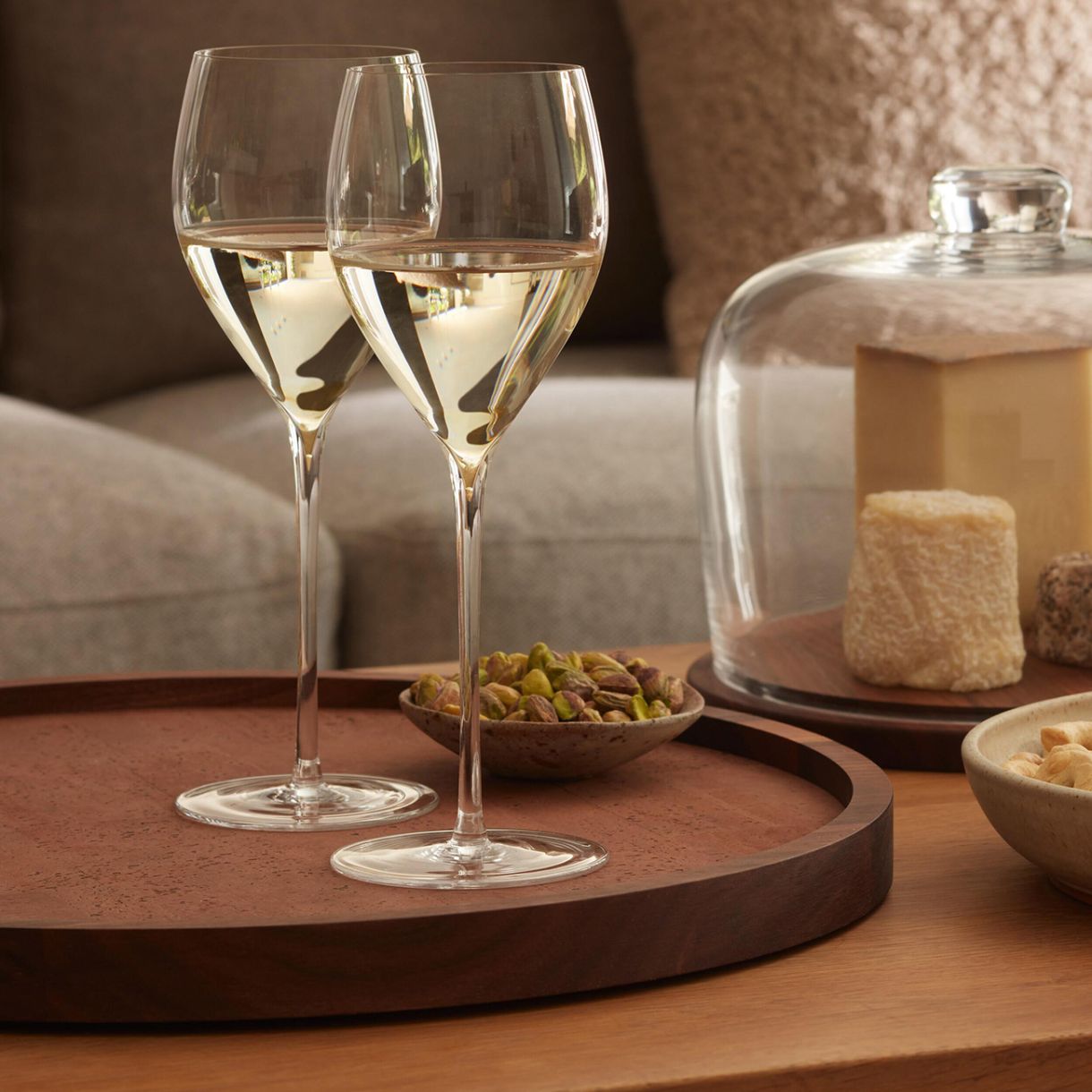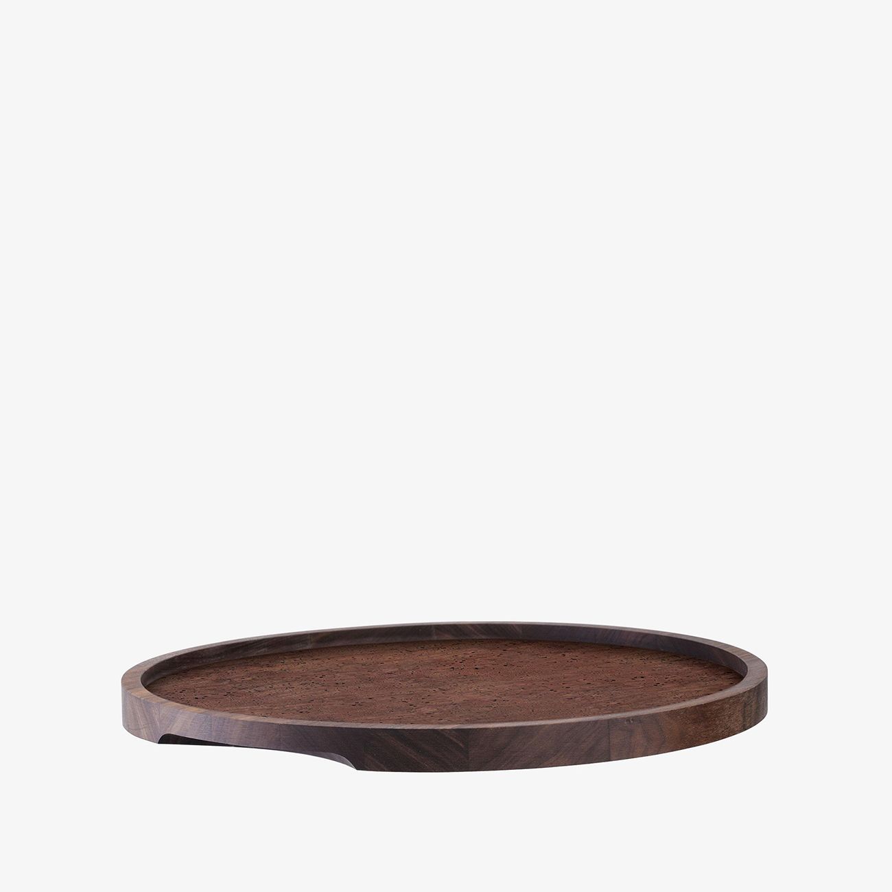 Голям, кръгъл поднос, изработен от орех от устойчив произход. Инкрустиран с тъмен корк и завършен с вдлъбнати дръжки.