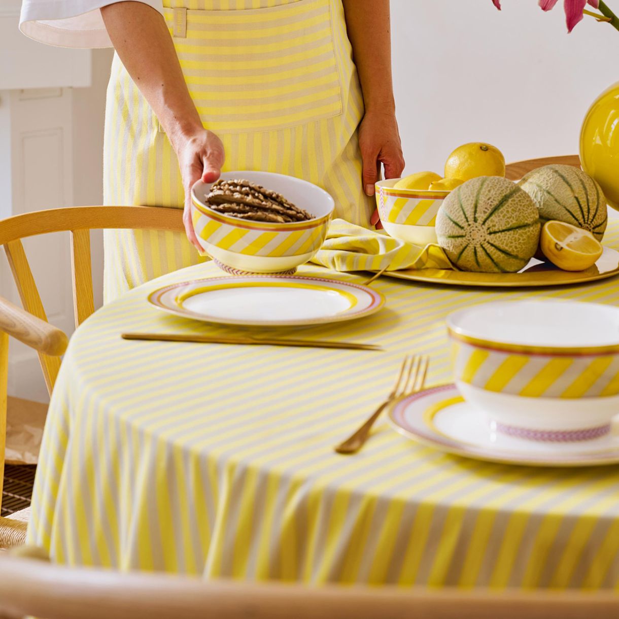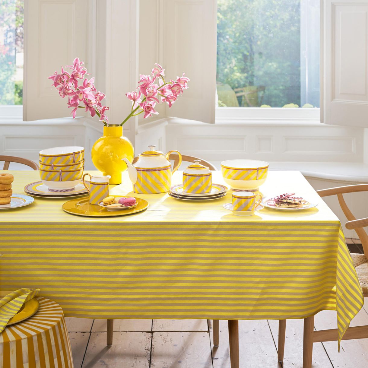 Покривка в двуцветно райе. Изработена е от 100% памук.