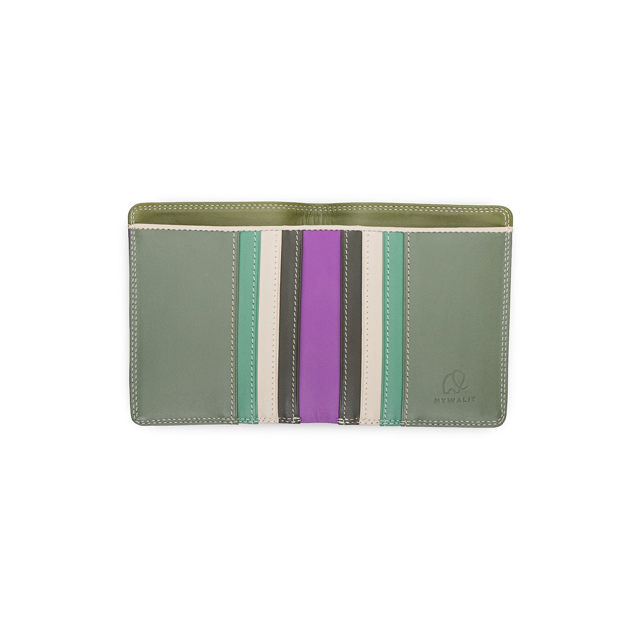 Класически портфейл в модерни цветове и заоблени ъгли. Има място за шест кредитни карти и секция за банкноти.