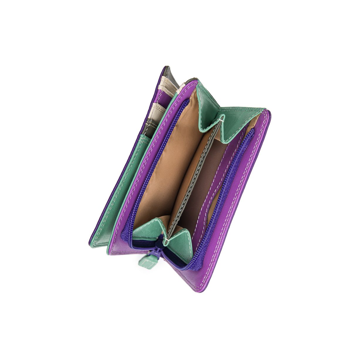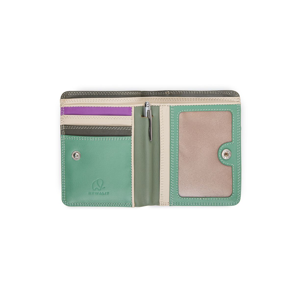 Компактен и дискретен. С отварянето на скритото тик-так копче се разкриват място за три карти, секция за банкноти, джоб за монети с цип, прозрачен джоб за документи за самоличност и мини писалка.