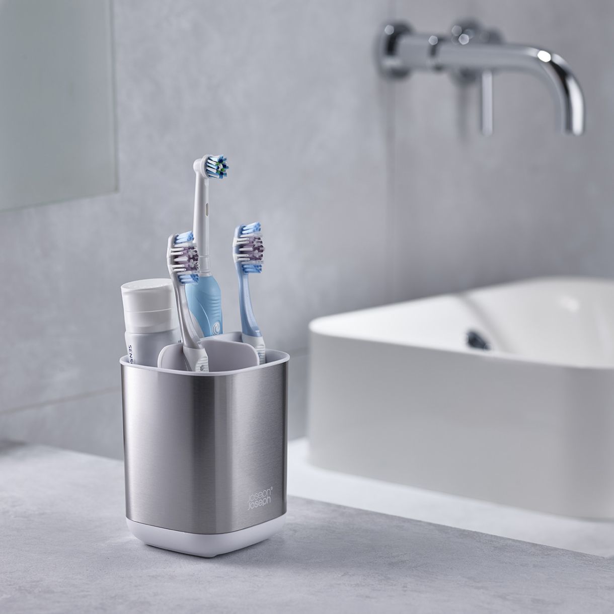 Тази умна поставка за четка за зъби на английската компания Joseph Joseph се разглобява за лесно почистване и разполага с вентилационен отвор за бързо изсъхване, което означава, че е по-хигиенично. Освен това има и неплъзгаща се основа.