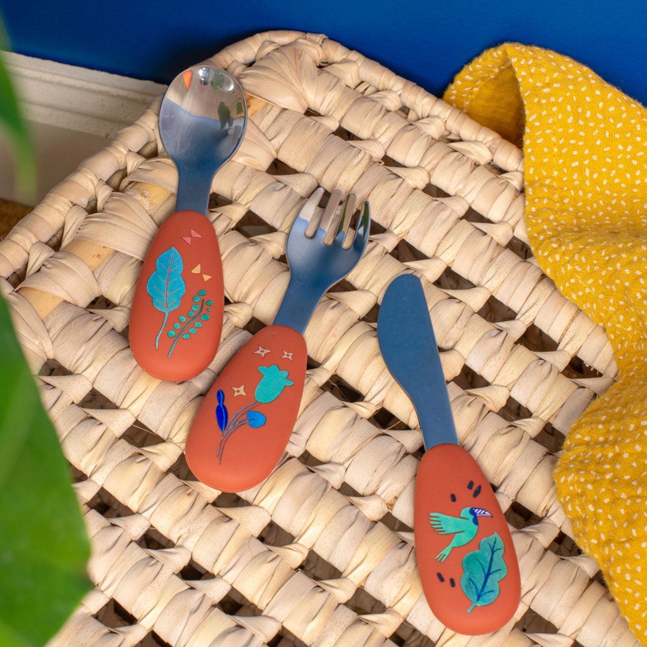 Комплект от 3 комплекта прибори за хранене от неръждаема стомана и силикон, за да се храните като възрастен! Атрактивно илюстрирани в цветовете на колекцията гората Мава.