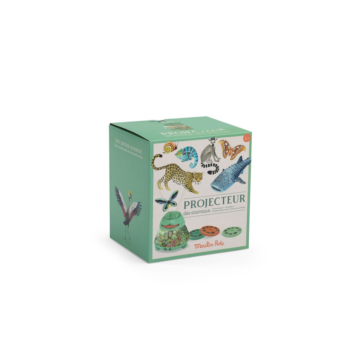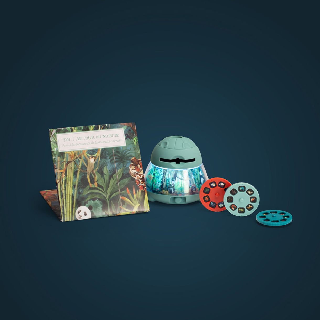 Проектор, който изобразчва 24 илюстрирани изображения от колекцията „Навсякъде по света“като разказват красиви истории за животни в небето, морето и на земята.. Вградената нощна лампа осветява красив пейзаж и се изключва автоматично след 15 минути. Съдържа 3 диска, всеки с по 8 слайда.
