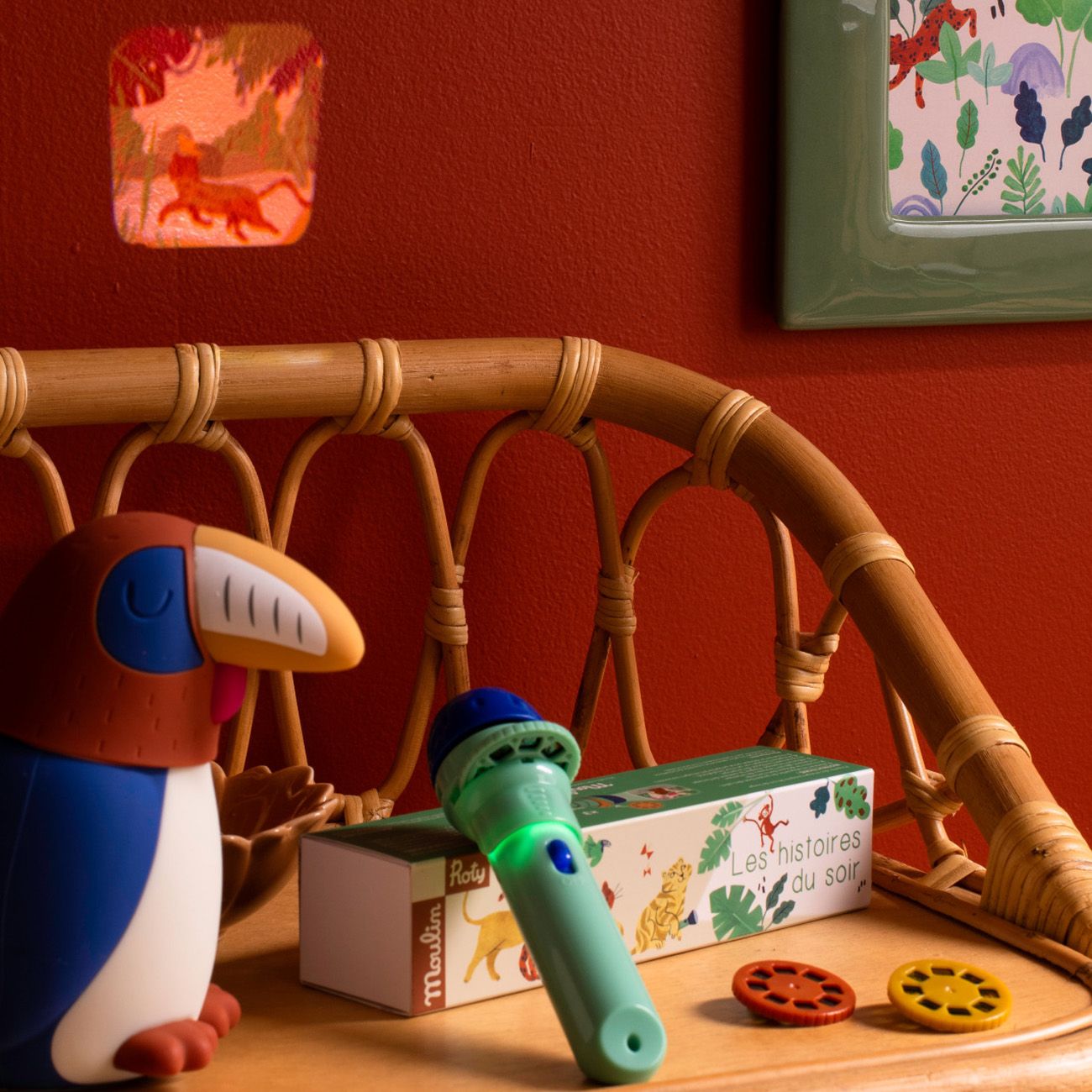 Разказването на приказки става лесно и вълшебно с джобната приказно фенерче! Част от колекцията гората Мава на Moulin Roty, тази лампа прожектира цветни изображения и пренася децата в магическия свят на животните от гората. Достатъчно е да изгасите светлината и пътешествието към страната на сънищата може да започне…
