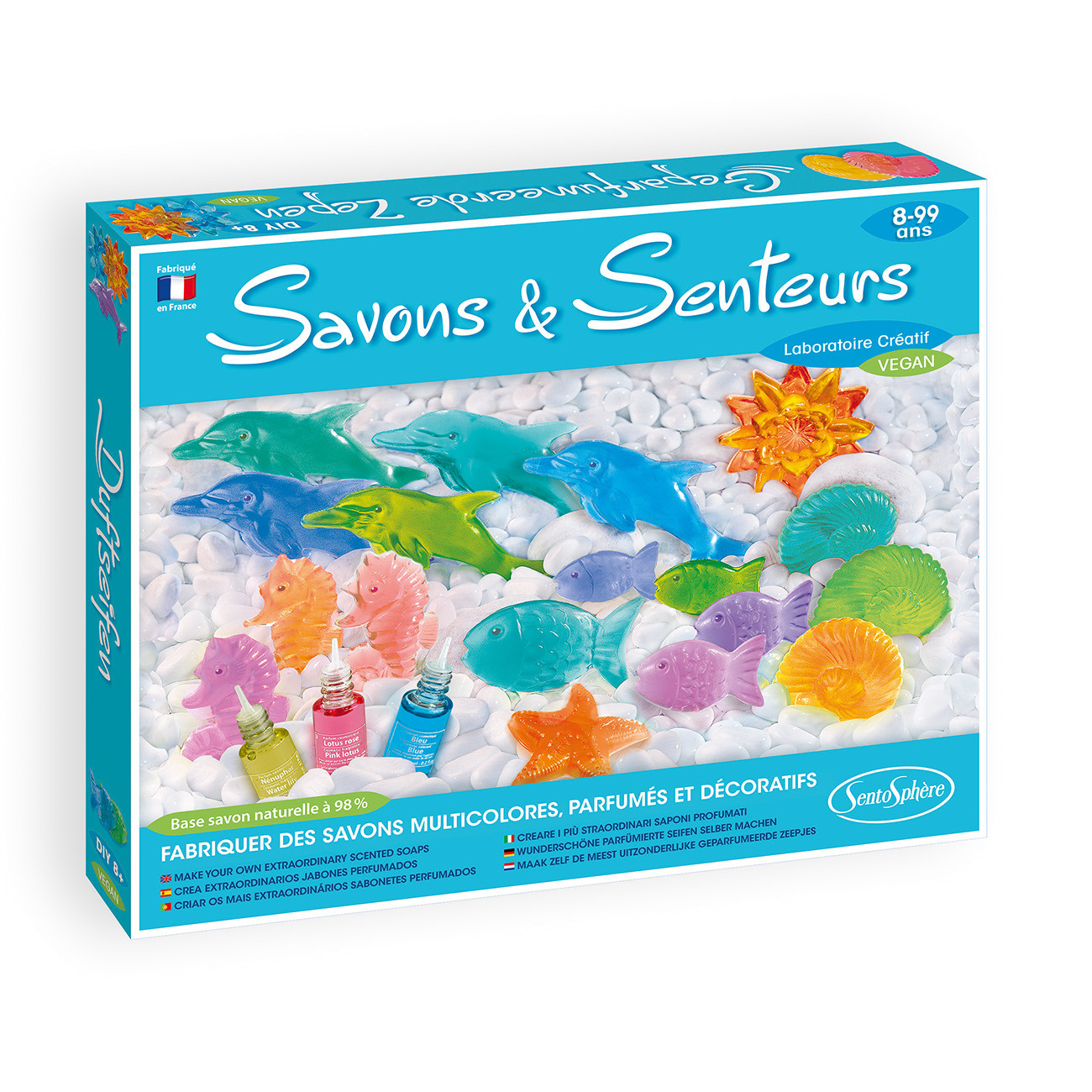 Ателие направи желирани сапуни позволява да създадете възхитителни и много качествени сапуни, благодарение на прозрачната глицеринова база. Глицеринът се разтопява в подходящ съд за 2 минути в микровълновата фурна или на водна баня, след което детето добавя различни аромати и оцветители. Сапунът се охлажда в рамките на минути и заема различни форми, които могат да бъдат отстранени лесно от калъпа. Сега само остава да го поставите в банята и е готов за ползване. Всички козметични продукти на SentoSphere са тествани под медицински контрол във Франция и са подходящи за чувствителна кожа. Не съдържат парабени.
