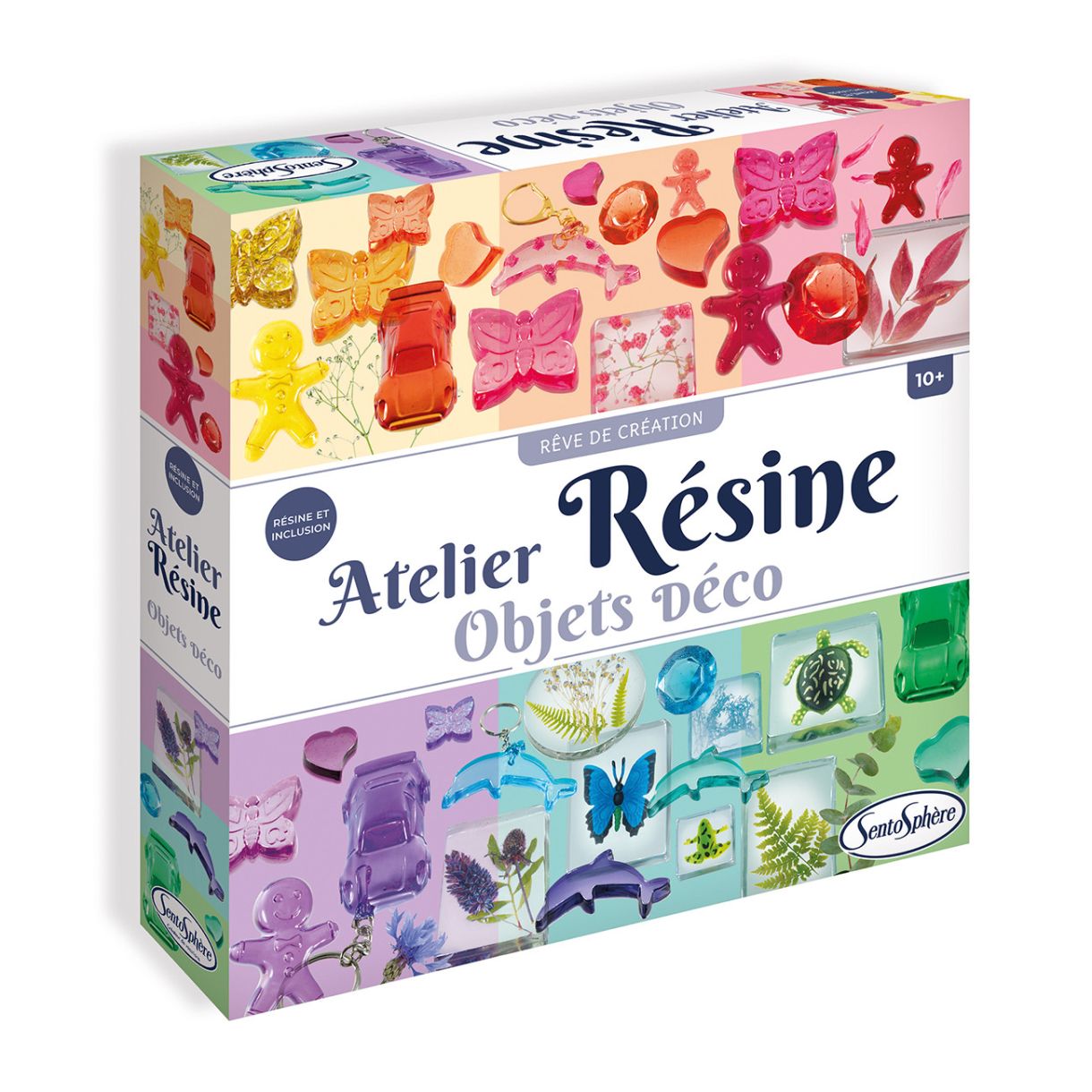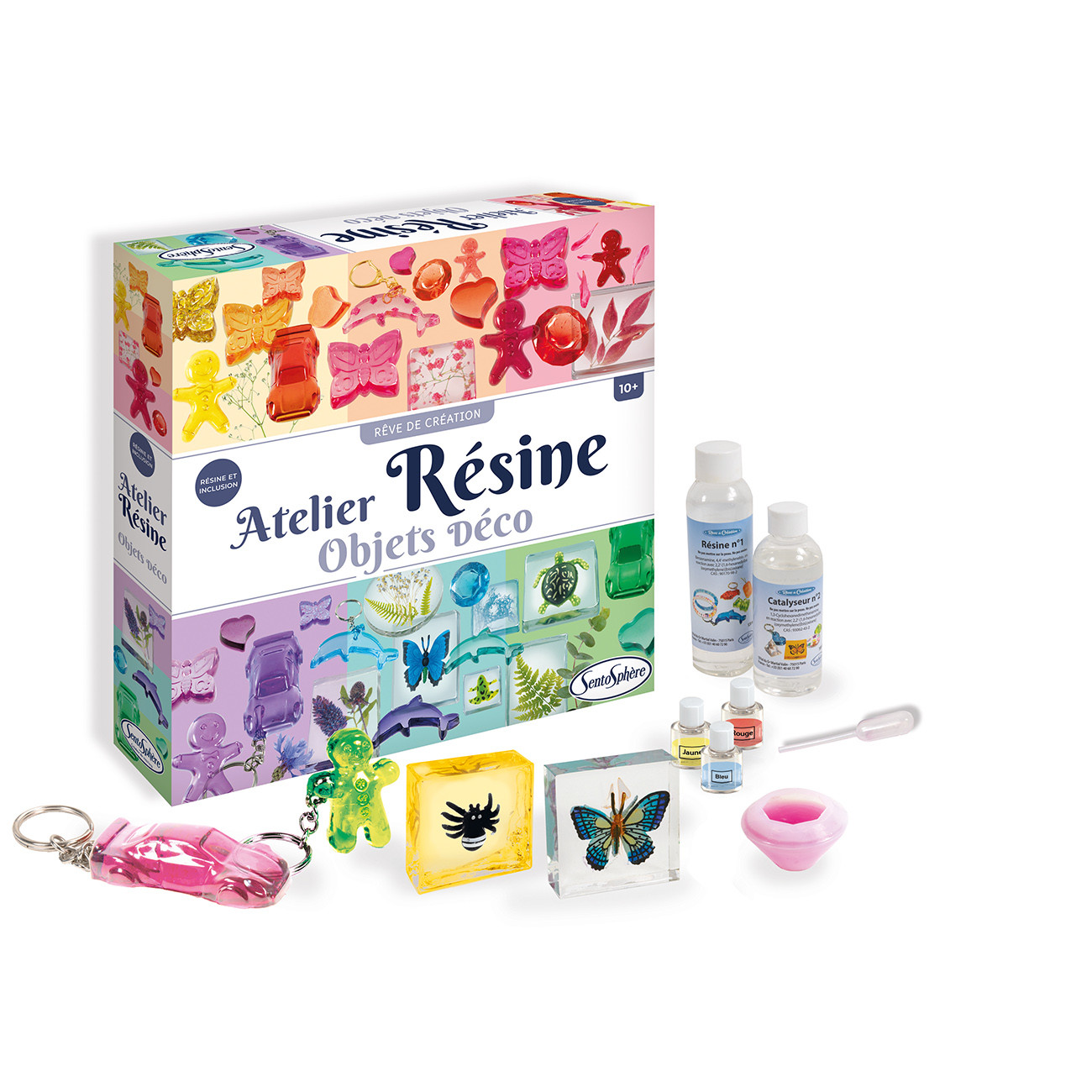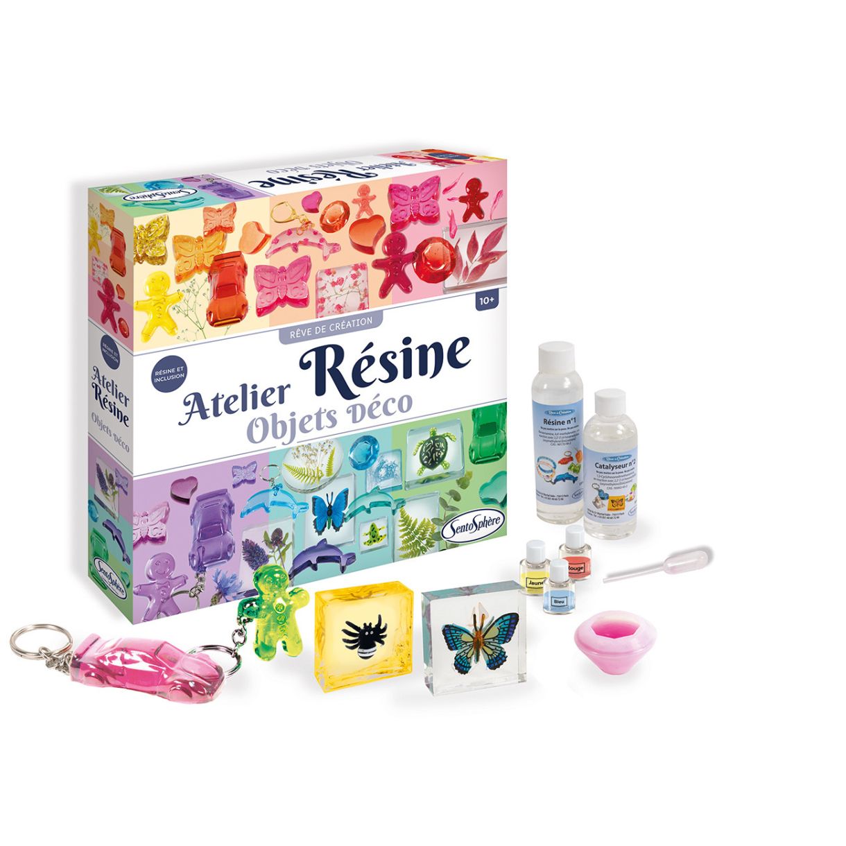 Създаването на красиви полупрозрачни скъпоценни камъни с блестящи и цветни включвания е вълшебен експеримент!Направете свои собствени приказни дизайни с този творчески комплект, като добавите инкрустации като насекоми, пеперуди и цветни златни листа! Всички манипулации са лесни и без риск. Можете да постигнете това, като просто смесите смолата и катализатора, добавите няколко капки оцветител, ако желаете, и след това излеете сместа в избраните от вас форми. 20 часа по-късно вашите творения могат лесно да бъдат извадени от формите, превърнати в превъзходни талисмани, ключодържатели или диаманти! Този комплект е носител на френската награда "les Etoiles du Jouet" през 2020 г. в категорията "Създавай и си представяй".