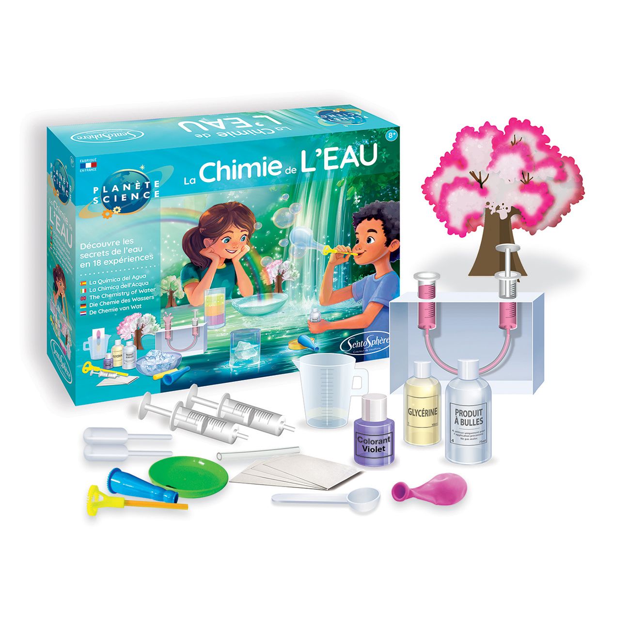 С този научен комплект се забавлявайте да откривате различни явления, свързани с водата: налягане, абсорбция, дестилация, филтрация, кондензация и мехурчета!Тази малка образователна лаборатория предлага 16 завладяващи експеримента, с които да се забавлявате, за да разберете физиката и химията на водата.