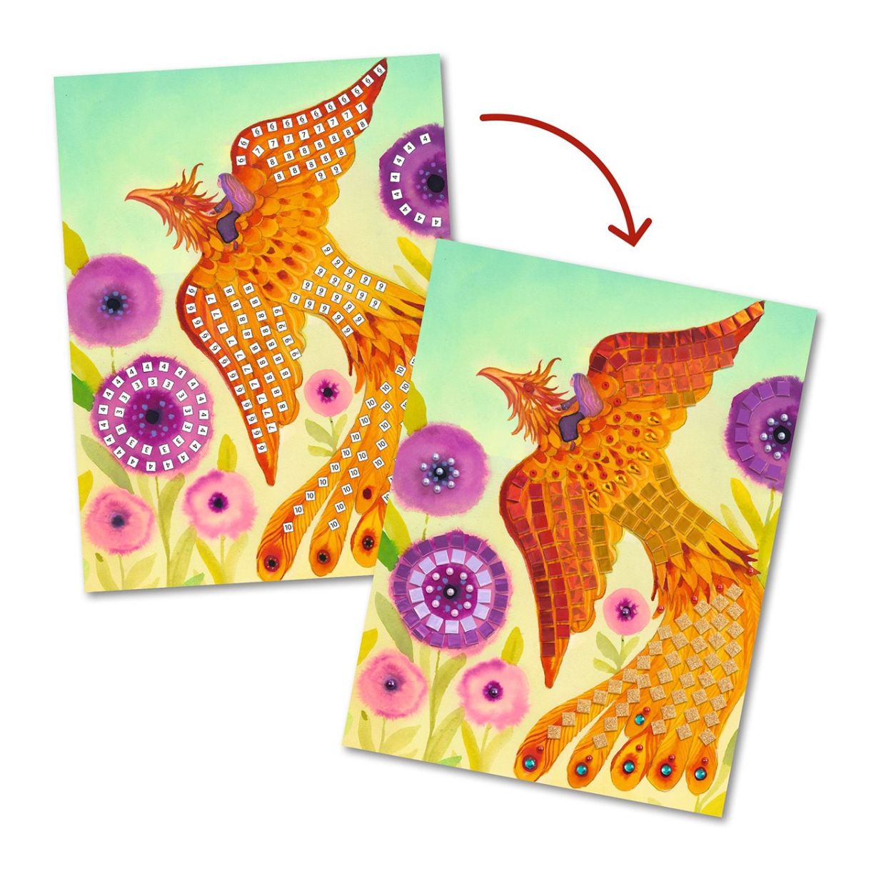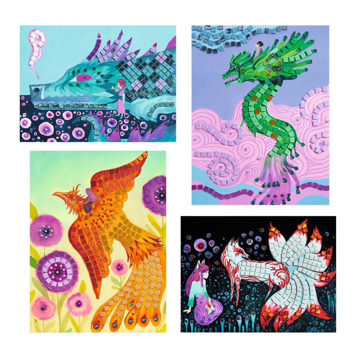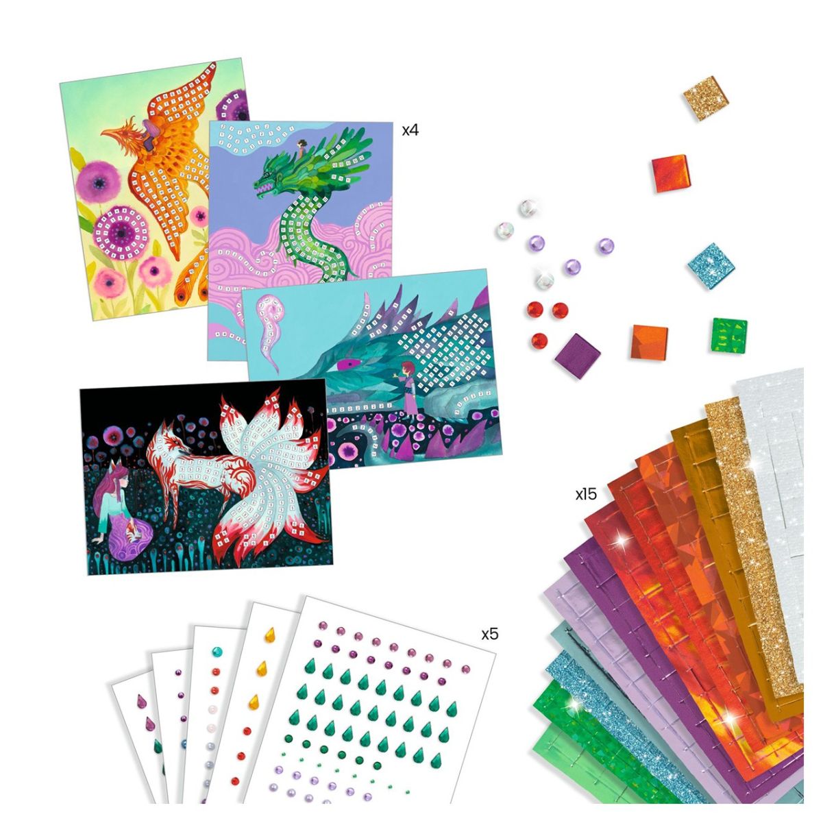 Комплект мозайка за начинаещи. Има 4 картини за допълване с малки блестящи квадратчета от пяна и стикери със кристали. Потърсете числата и залепете частите, съответстващи на правилната област на дъската. От огнени пера или козина до изумрудени или ледени люспи, вдъхнете живот на тези портрети на 4 митични създания.