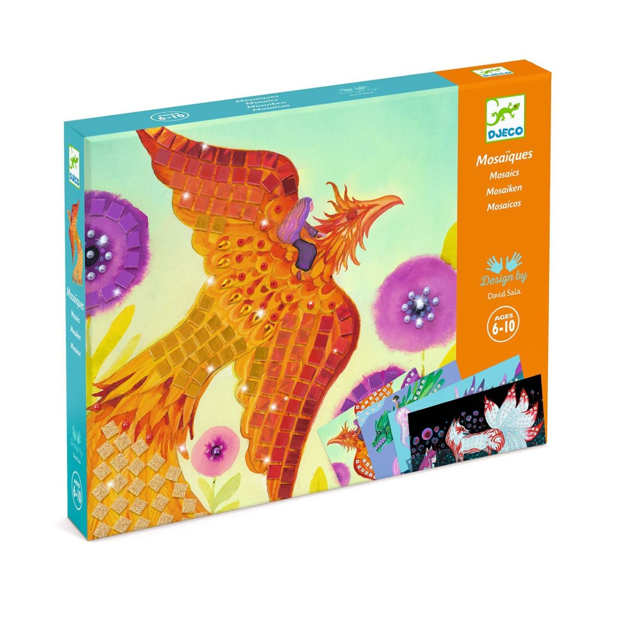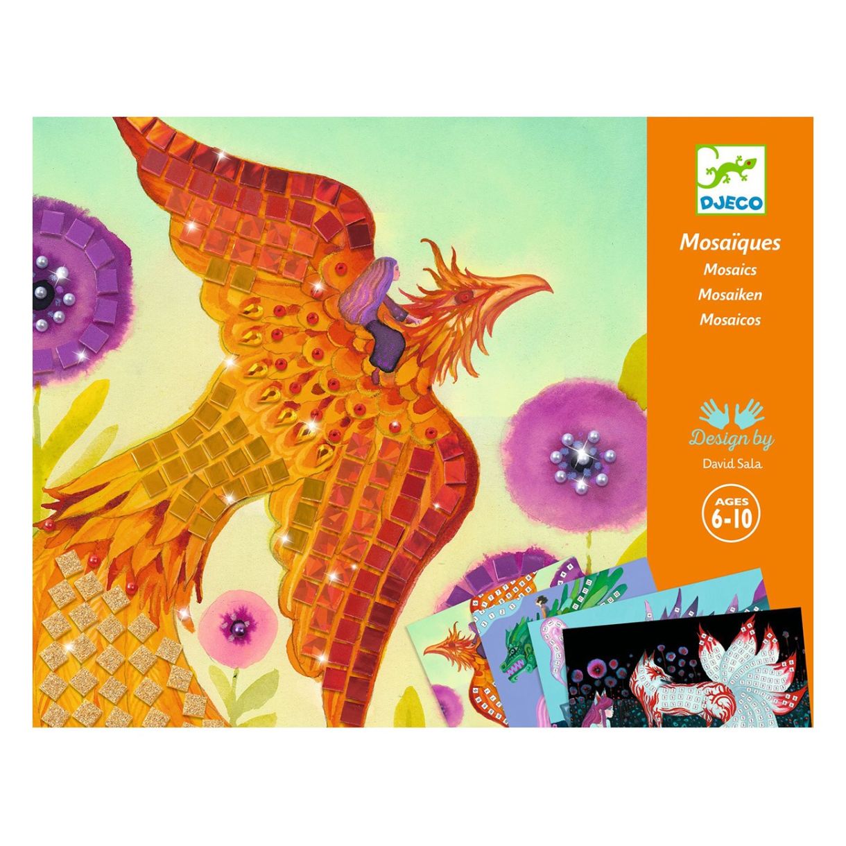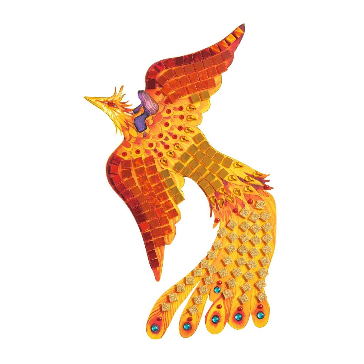 Комплект мозайка за начинаещи. Има 4 картини за допълване с малки блестящи квадратчета от пяна и стикери със кристали. Потърсете числата и залепете частите, съответстващи на правилната област на дъската. От огнени пера или козина до изумрудени или ледени люспи, вдъхнете живот на тези портрети на 4 митични създания.