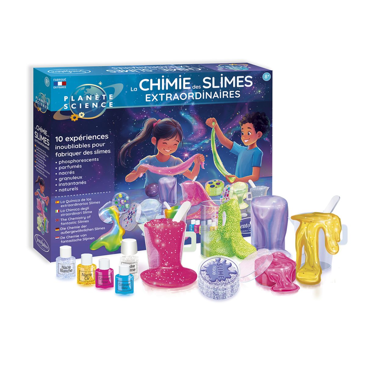 Тази забавна научна лаборатория ще ви помогне да създадете златисти, сребристи, перлени, пясъчни, зърнести, ароматни и фосфоресциращи слузи! Приготвя се бързо и лесно, тъй като всички манипулации се извършват с нетоксични и студени съставки. Забавлявайте се, смесвайки 3-те ароматизирани неонови оцветителя и седефените пигменти, за да създадете желетата на вашите мечти! Можете дори да добавите блясък и полистиренови мъниста за повече текстура. Децата просто ще обичат да създават свои собствени желета, докато откриват нови текстури. Произходът и свойствата на всяка съставка са подробно обяснени за пълноценно научно и сетивно откритие! Готовите желета могат да се съхраняват няколко седмици в предоставените кутии, които можете да украсите със залепващи кристали и стикери.