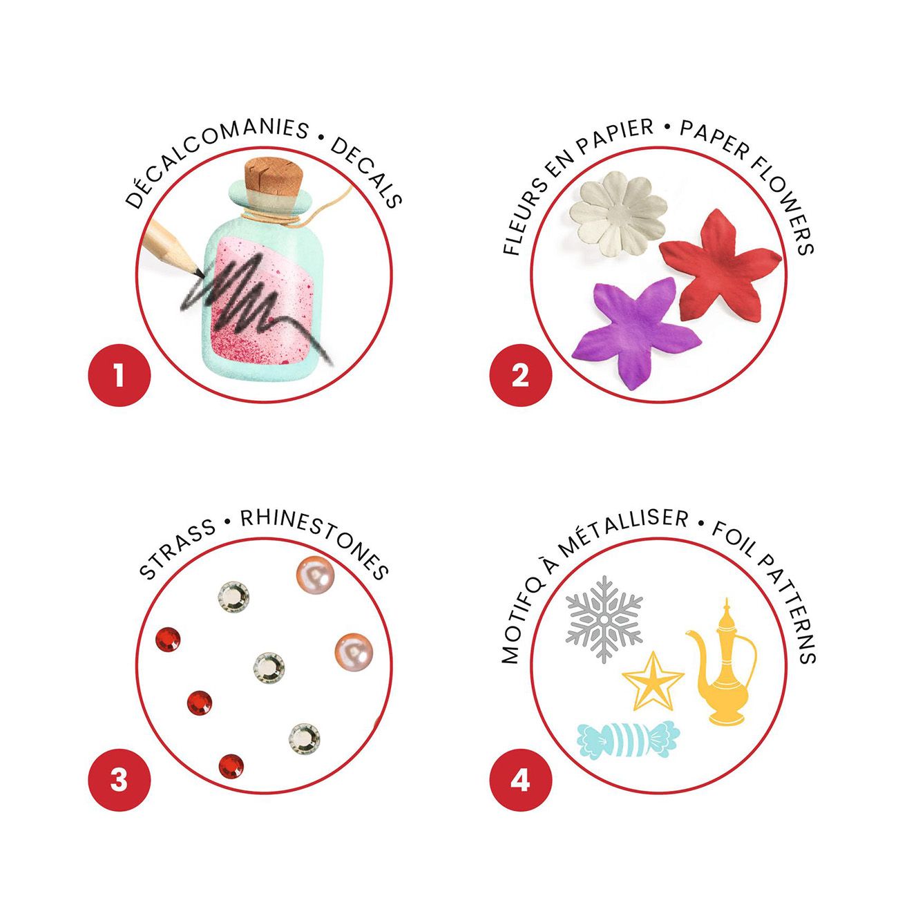 Украсете всяка дъска с трансфери за триене, хартиени цветя, самозалепващи се кристали и фолио с мотиви. 4 пъти повече дейности за 4 пъти по-впечатляващ резултат!