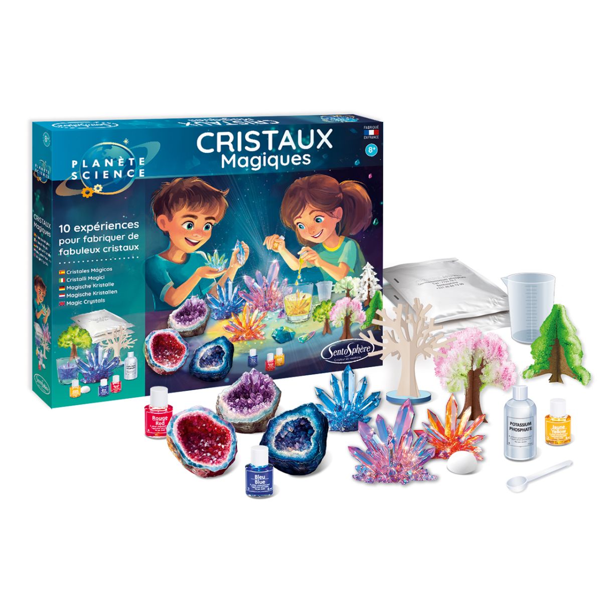 Ами ако създаването на кристали беше детска игра? Комплектът „Магически кристали“ превръща науката в едно вълнуващо приключение! Само за няколко дни ще можете да направите красиви, цветни кристали и да откриете тайните на кристализацията чрез 10 невероятни експеримента. Ще можете да направите красиви жеоди върху яйчни черупки, да създадете цветни кристали с размер 5 см в различни форми и дори да отгледате магически дървета. Само за няколко минути те ще се превърнат пред очите ви в японски череши или заснежени ели, благодарение на процеса на кристализация. С включените 3 оцветителя (жълт, син, червен) изберете любимите си цветове или измислете свои, като ги смесвате. Дайте воля на въображението си!Следвайте инструкциите стъпка по стъпка. Открийте всички наши научни игри, идеални за учене, докато се забавлявате, експериментирате у дома и впечатлявате цялото семейство!