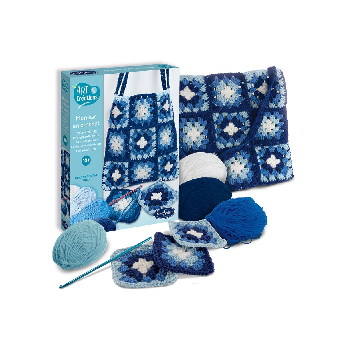 Перфектен комплект за учене на плетене на една кука чрез изработване на пачуърк квадратчета. След като бъдат сглобени, те ще образуват красива чанта в нюанси на синьото. Идеална за съхранение на вашите вещи и книги. Вълната (50% памук - 50% акрил) е идеална за учене, а инструкциите стъпка по стъпка обясняват перфектно техниката за изработване на бабини квадратчета.