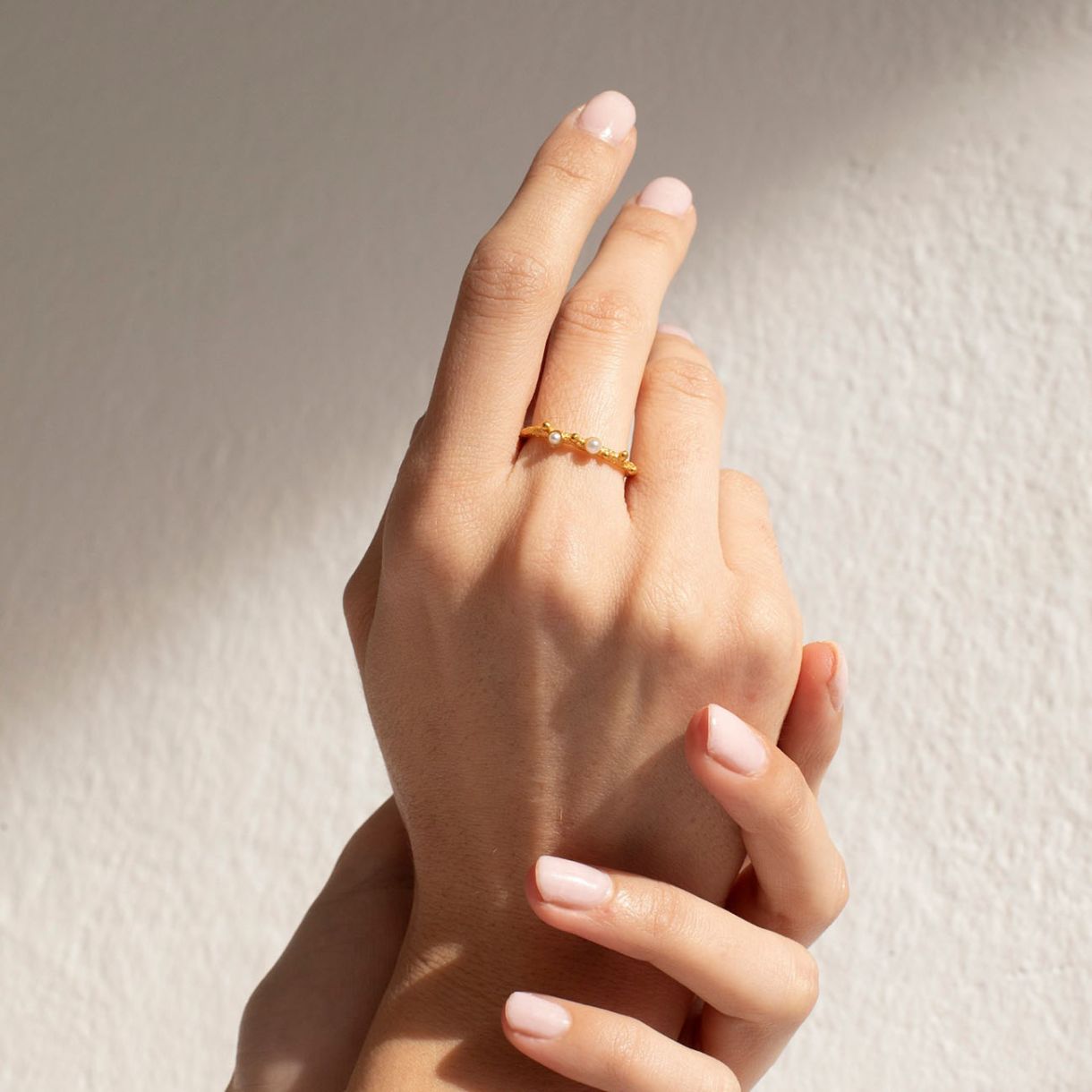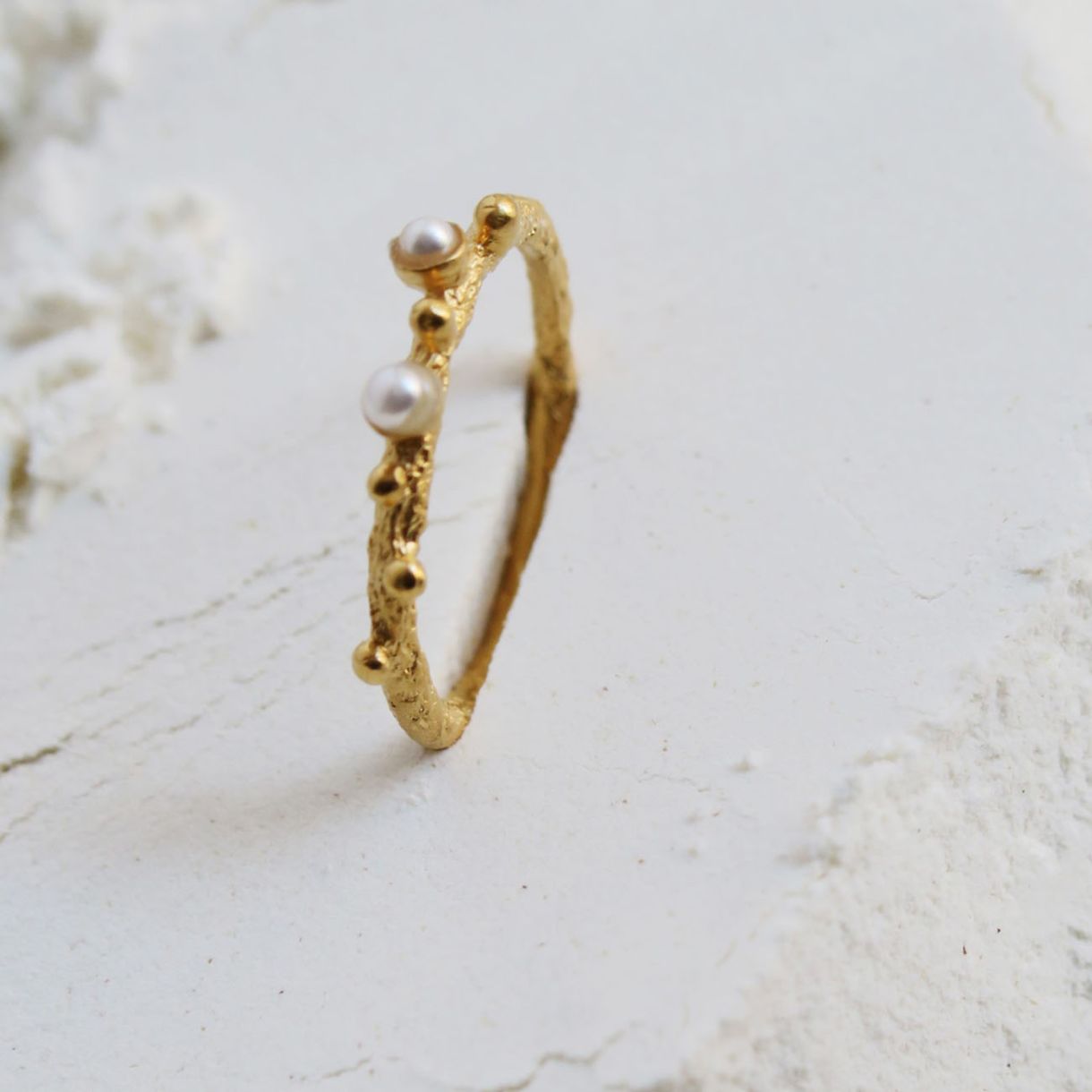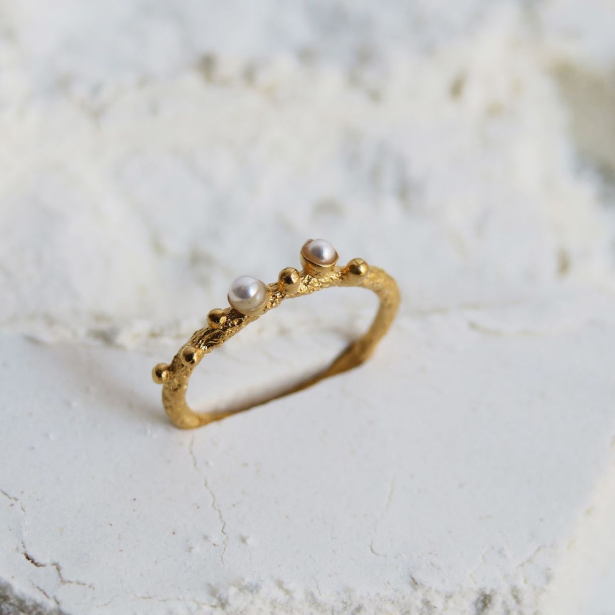 Текстуриран златен пръстен с метални топчета и деликатни перли от смола. Изработен от сребро 925 с 24К златно покритие.