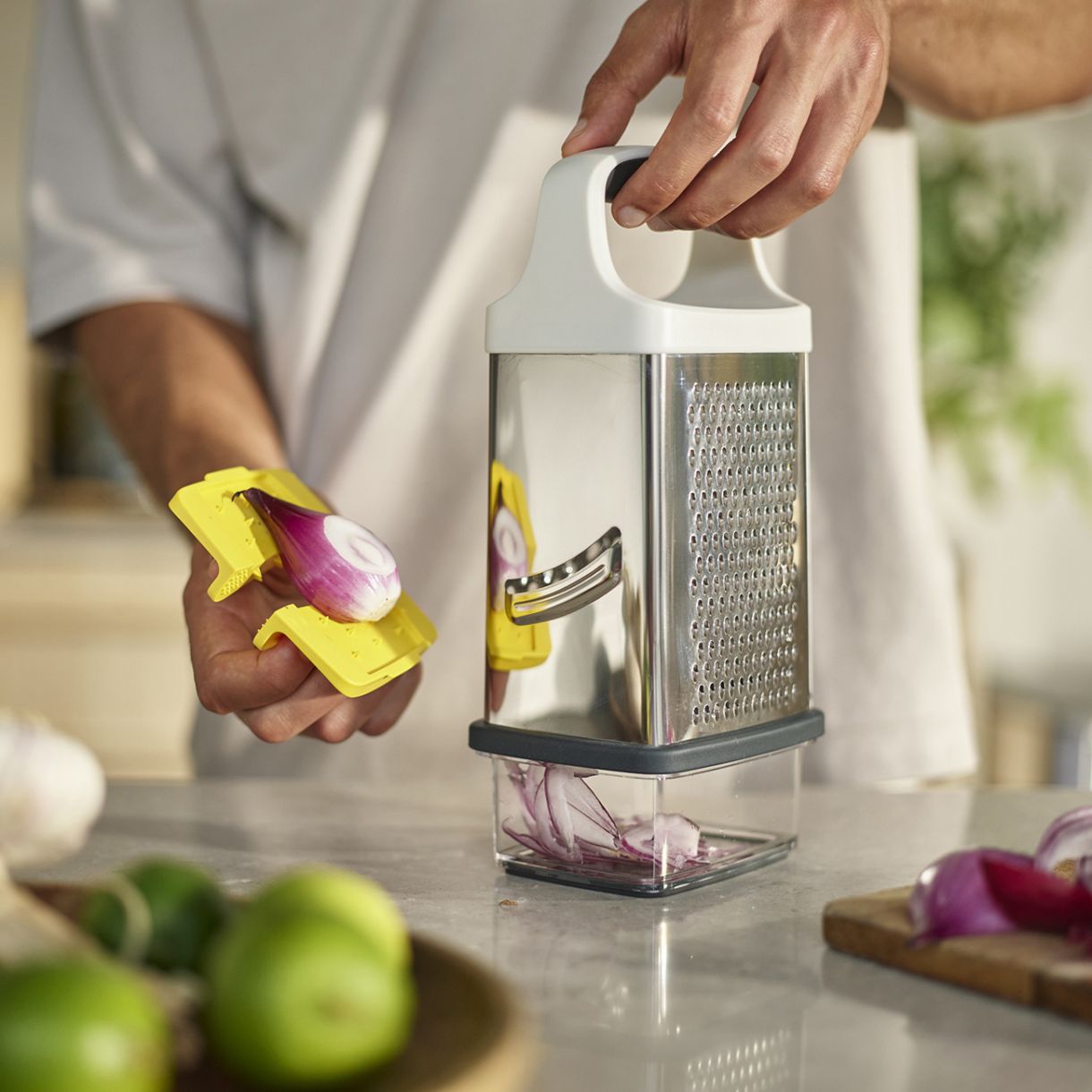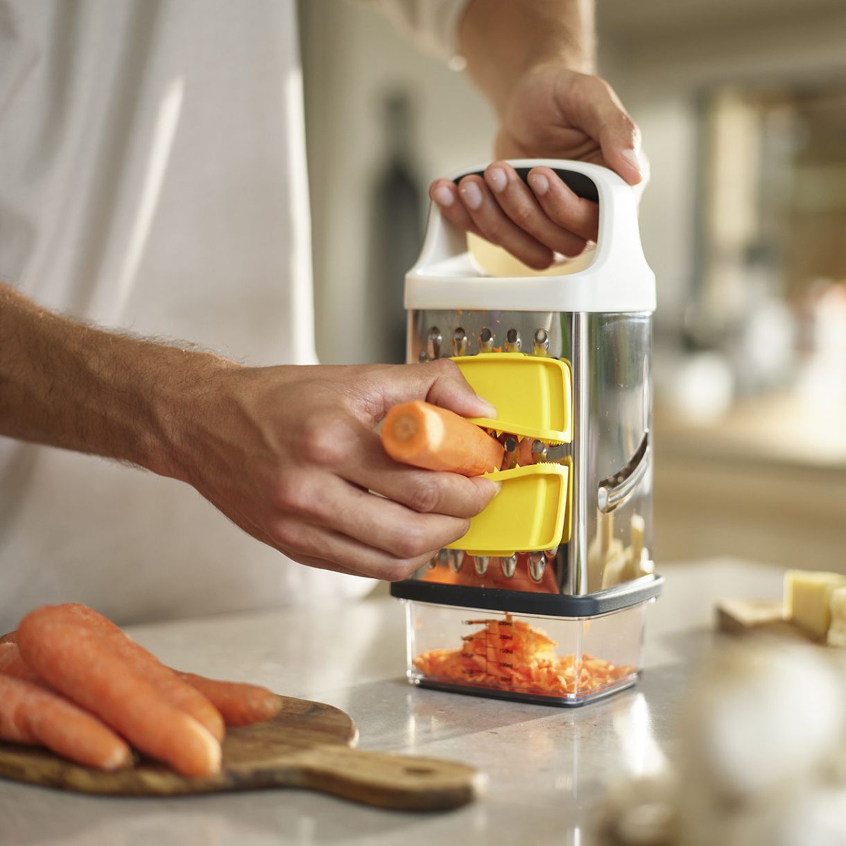 Най-доброто ренде, проектирано с прецизна дръжка за зеленчуци за безопасно и прецизно нарязване и настъргване. С четири остри като бръснач остриета от неръждаема стомана за лесно приготвяне на храна.