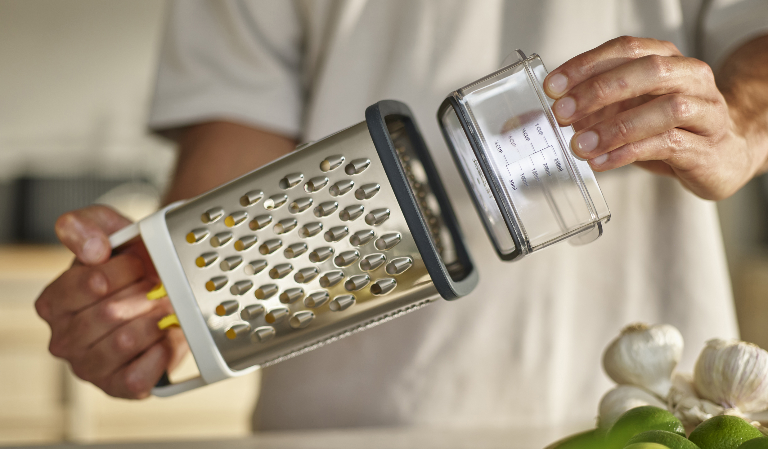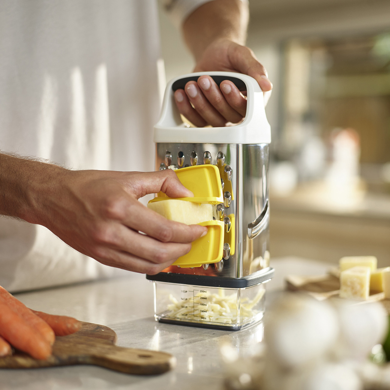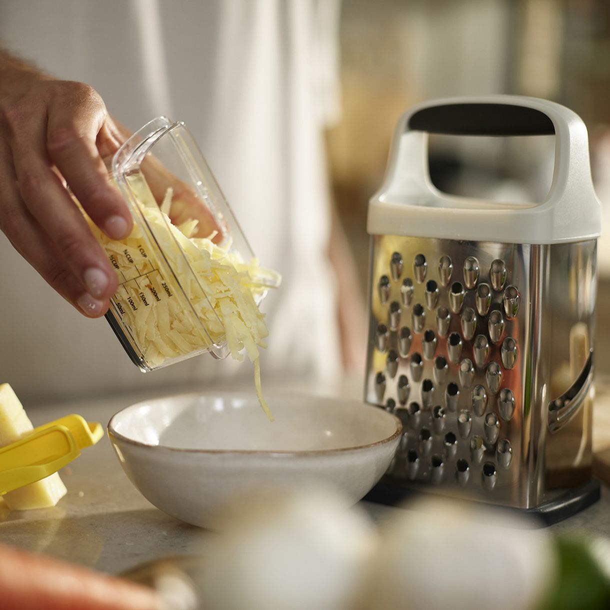 • Контейнера в основата има мерни единици и е прозрачен, така че можете да видите колко сте настъргали.