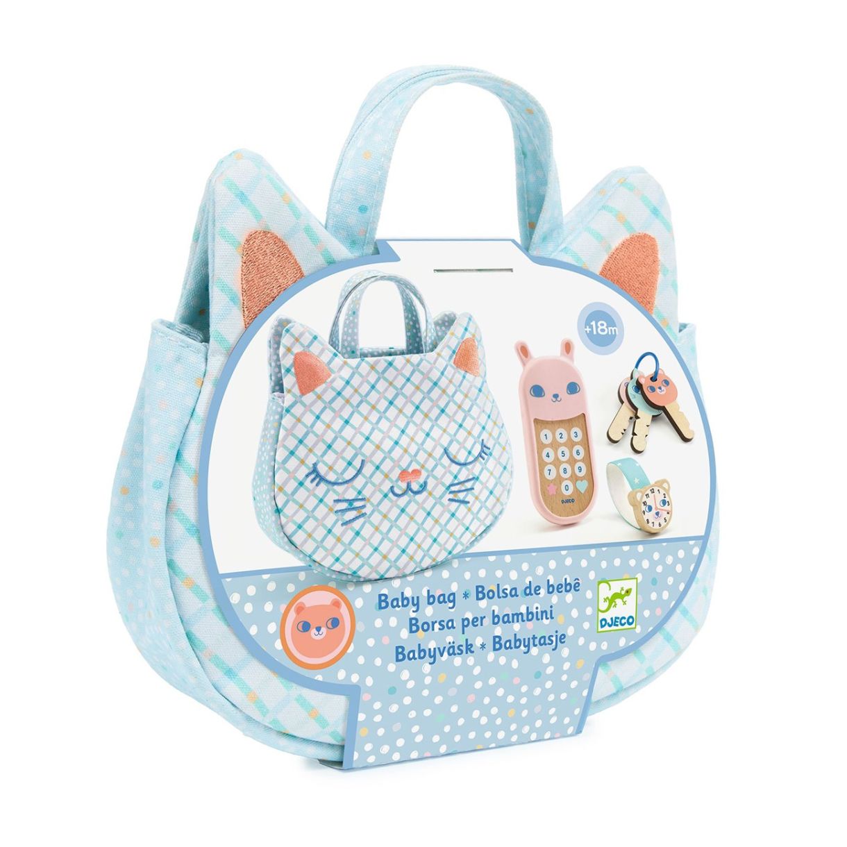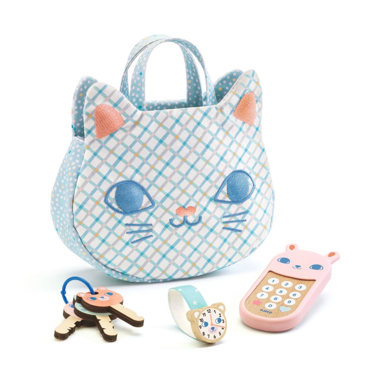 Красиво бродирана чанта във формата на котешка глава. Вътре има някои основни аксесоари за игра на възрастни: часовник с еластична каишка, телефон с калъф и връзка от 3 ключа. И дори с всички тези аксесоари, все още има място за вашето плюшено мече!