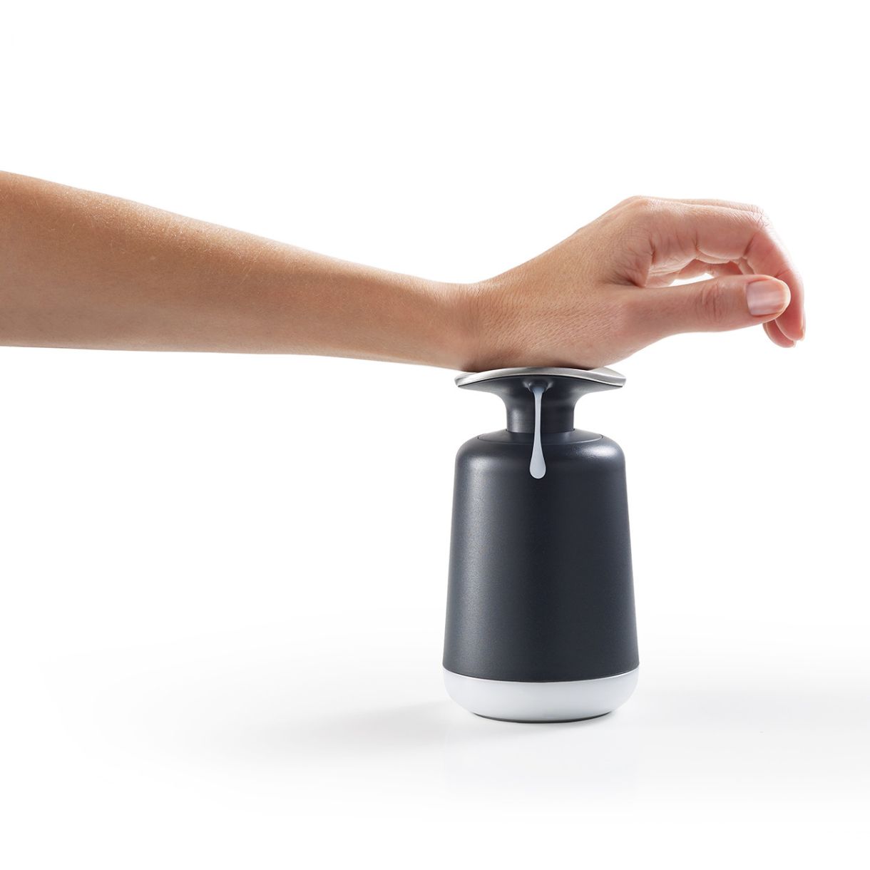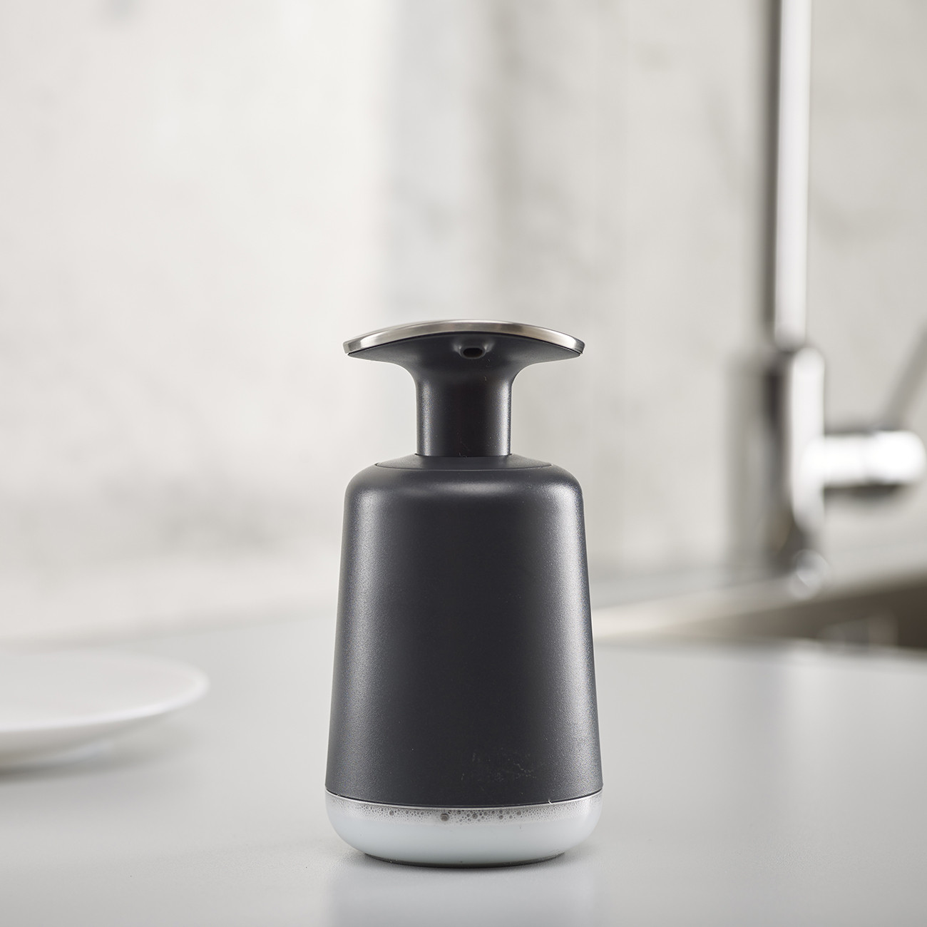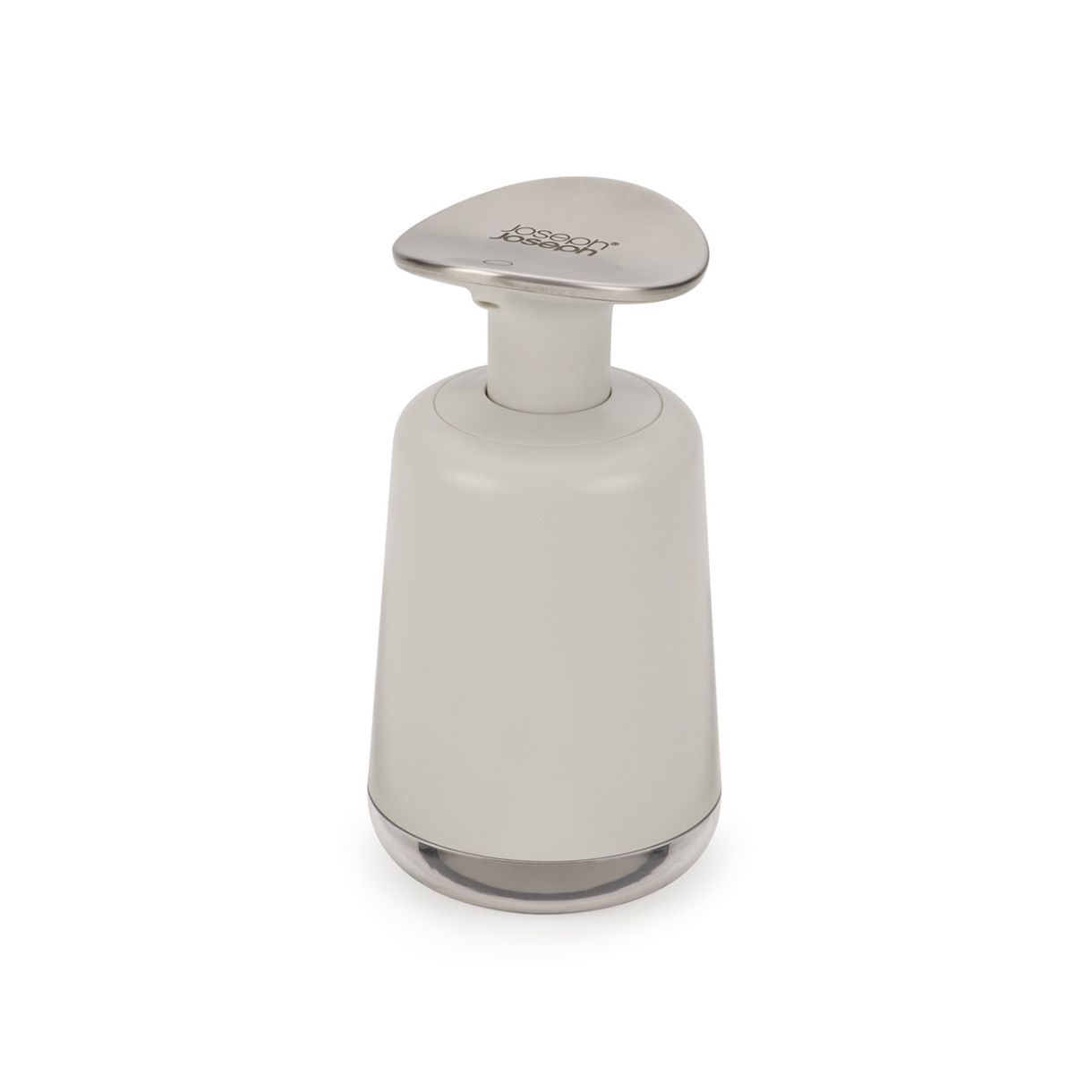 Прозрачен прозорец в основата показва, когато трябва да се напълни отново, а противоплъзгащата основа поддържа дозатора на място по време на употреба.