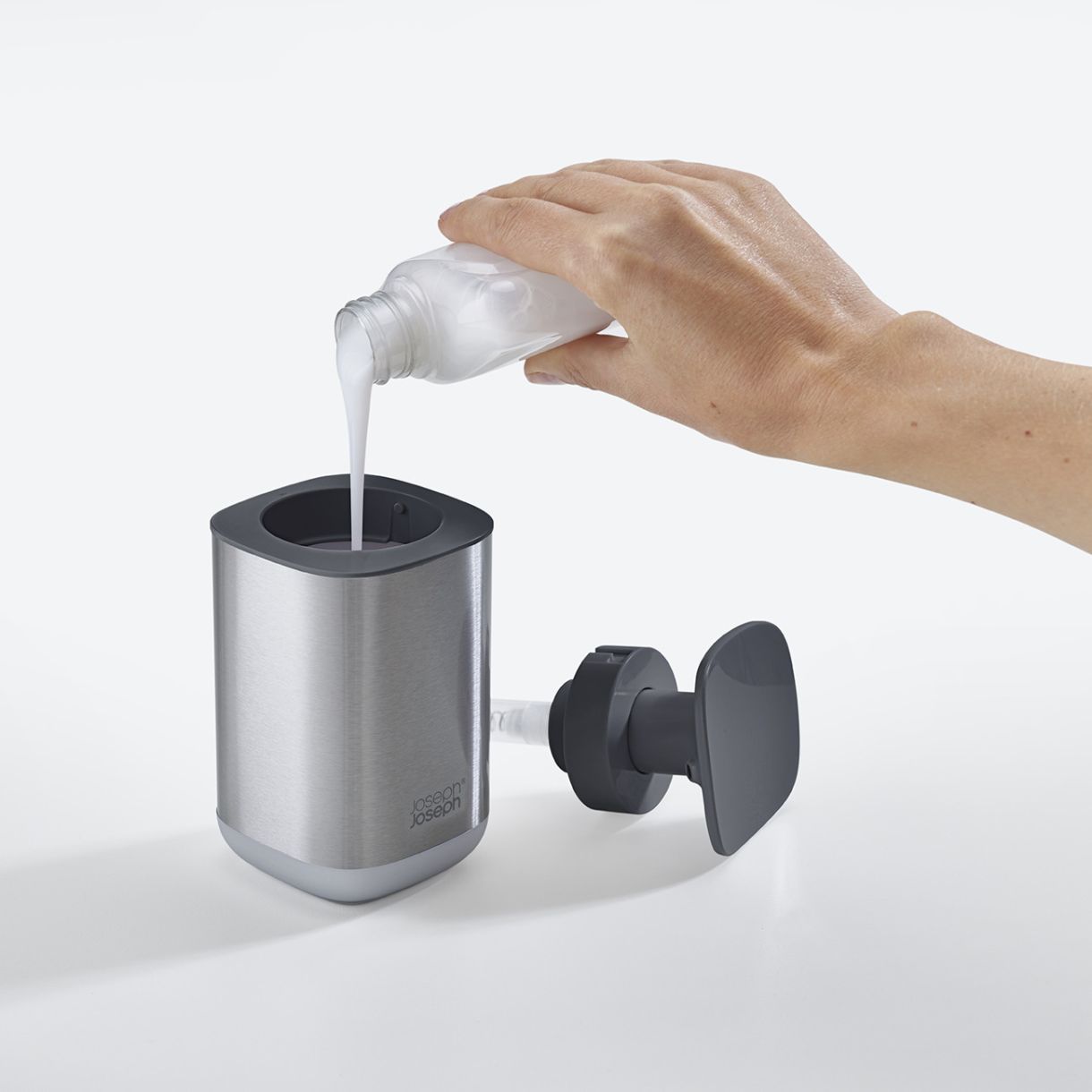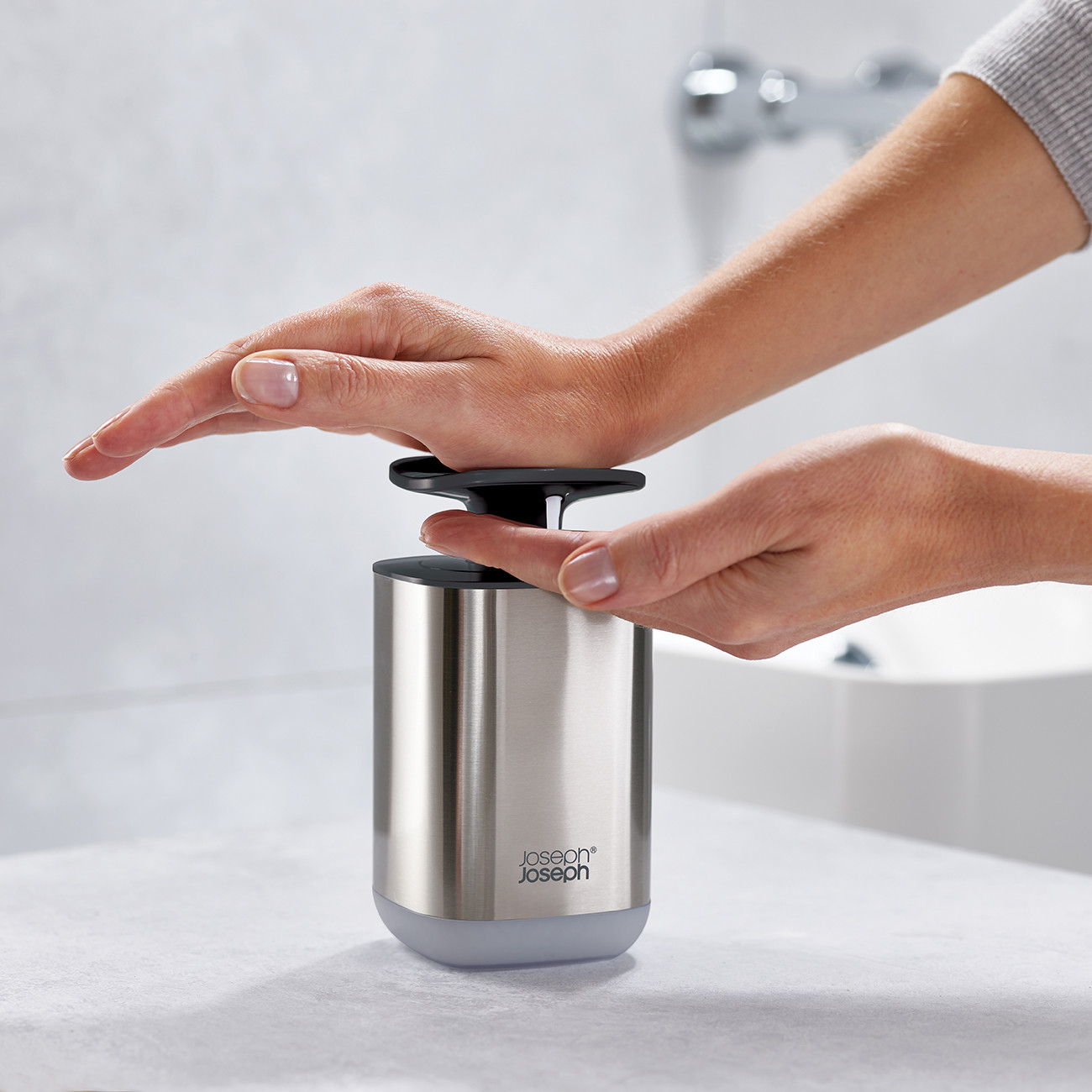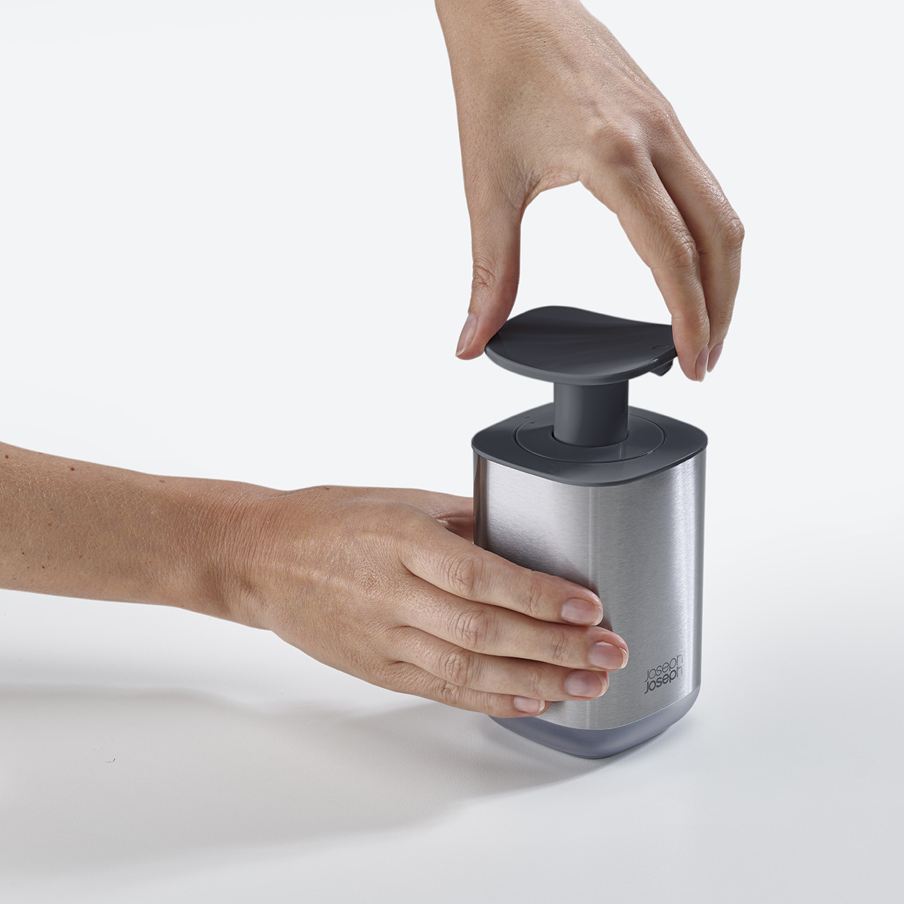 Този хигиеничен дозатор за течен сапун на английската компания Joseph Joseph, разполага с изключително голяма глава на помпата, която улеснява работата с китката, когато ръцете ви са изцапани.