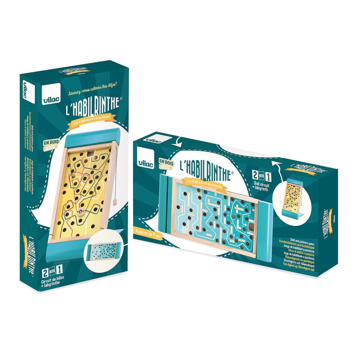 Открийте играта Habilrinthe на френската фирма Vilac - дървена игра 2 в 1 за деца на възраст над 5 години, която развива търпението, двигателните умения и сръчността.  Habilrinthe е съкращение от „сръчен“ и „лабиринт“ и е игра 2 в 1: от една страна, като управлявате 3-те дръжки, трябва да завършите 3 курса с нарастваща трудност, като насочвате топчето между дупките, без то да пада, а от друга - друга страна е лабиринт, който трябва да завършите, като насочвате топчето само чрез накланяне на играта във всички посоки. На пръв поглед е доста лесно, но дали ще успеете да преминете през целия път?