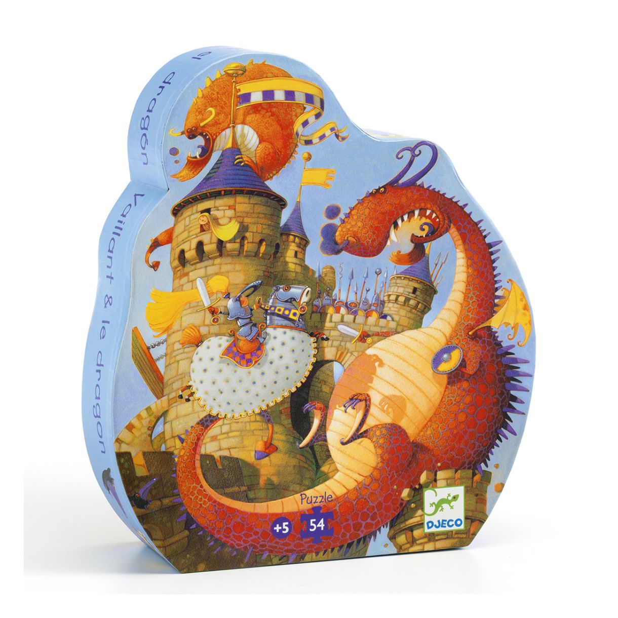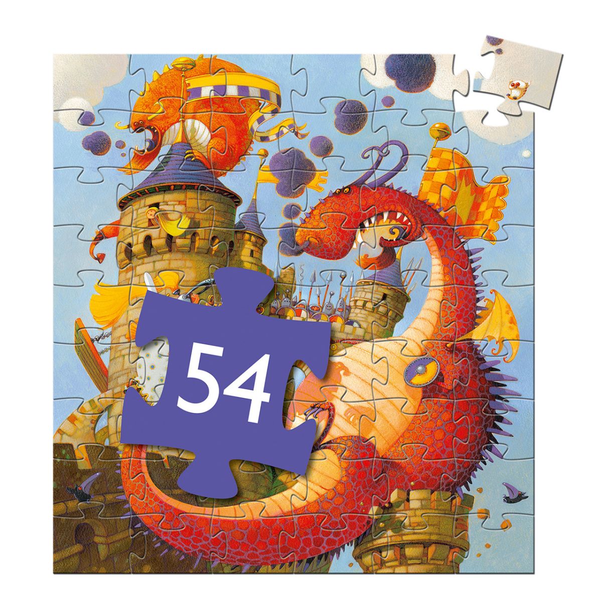 Смел рицар се бие с драконите, за да спаси принцесата в нейния замък. Превъзходен пъзел от 54 части в стилна кутия с формата на замък.