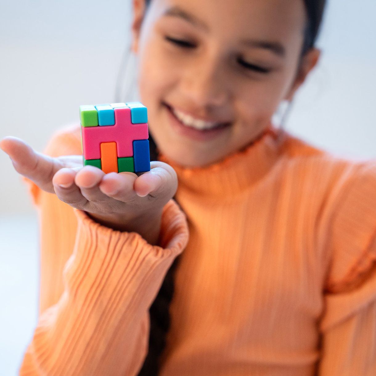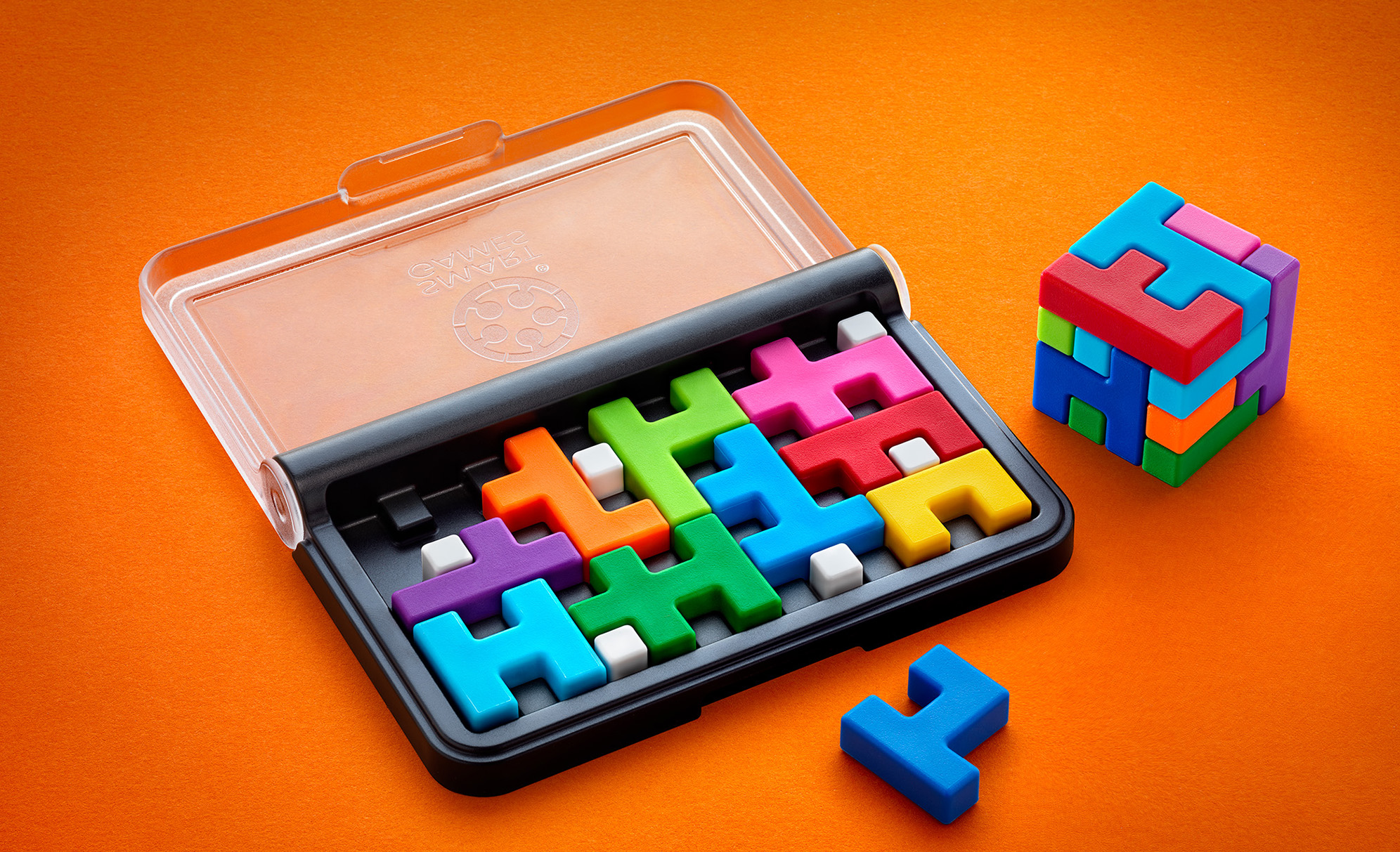 Голямо забавление в малка опаковка! Компактна логическа игра със смела амбиция: Можете ли да решите 120 прогресивни предизвикателства, като подредите 10 цветни, меки на допир части, за да запълните дъската, или като построите перфектен 3D куб? Тактилен логически пъзел, безкрайно завладяващ и идеален както за деца, така и за възрастни.