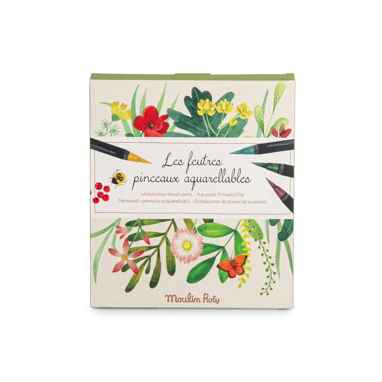 Кутия с 12 акварелни флуамстера с меки накрайници. Може да се използват така или с четката с воден резервоар за безкрайна игра с цветовете.
