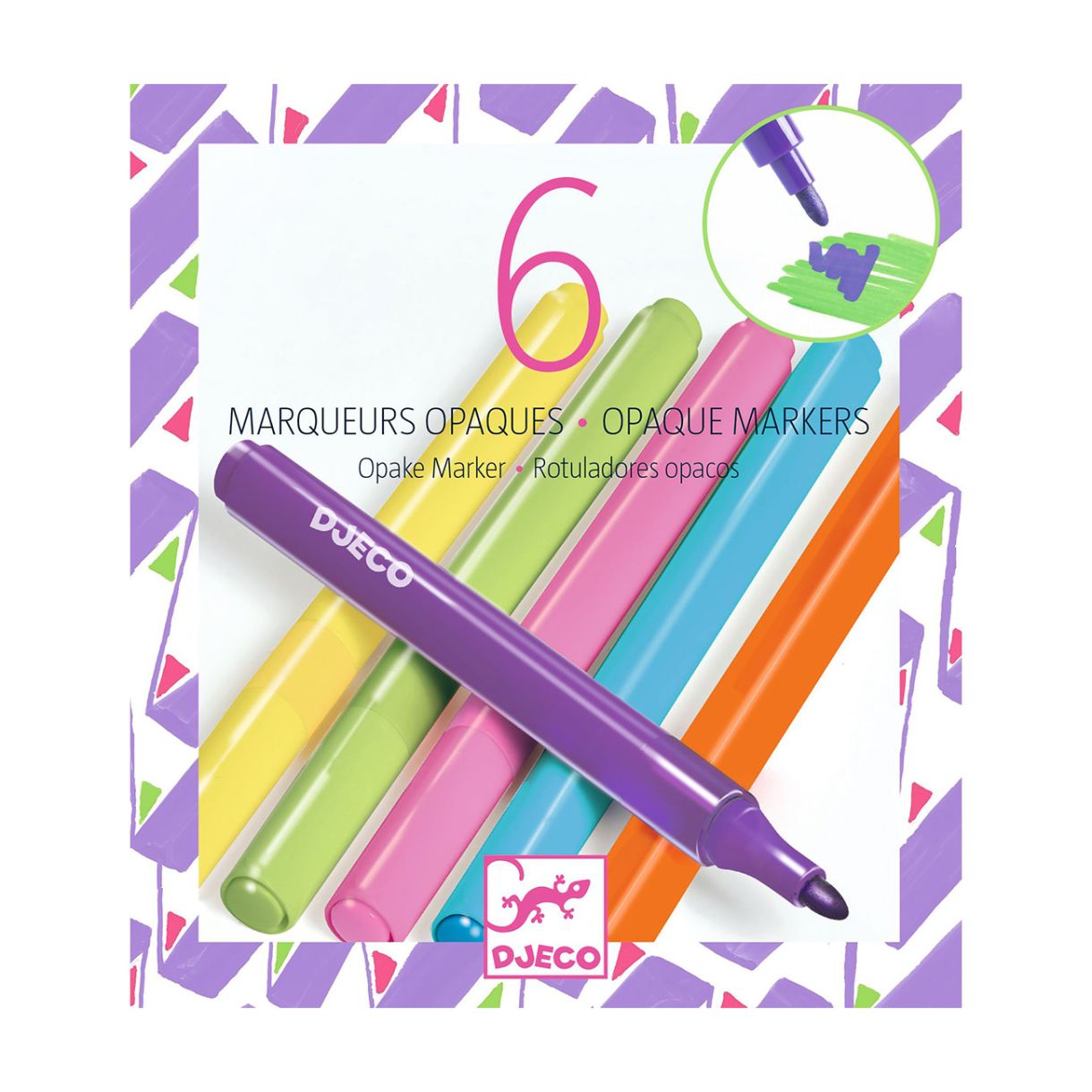 Колекция от 6 ярки, непрозрачни маркери (жълт, зелен, розов, син, оранжев, лилав), предназначени за проекти в стил „стрийт арт“, подходящи за деца над 6 години и използваеми върху различни повърхности като хартия, дърво и порцелан, предлагащи многослойни, подобни на боя ефекти, които съхнат бързо.