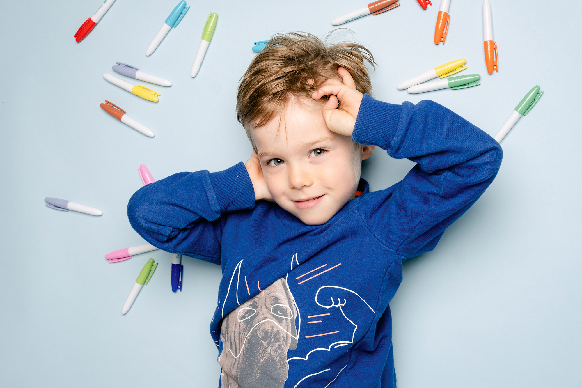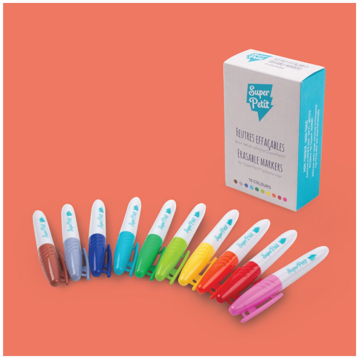 Комплект от 10 изтриваеми маркера, специално създадени за силиконовите подложки на SuperPetit. С ярки цветове и бързосъхнещо мастило, те позволяват безкрайно рисуване, изтриване и създаване на нови творби. Подходящи за деца над 3 години, те са идеални за игра у дома или в движение.