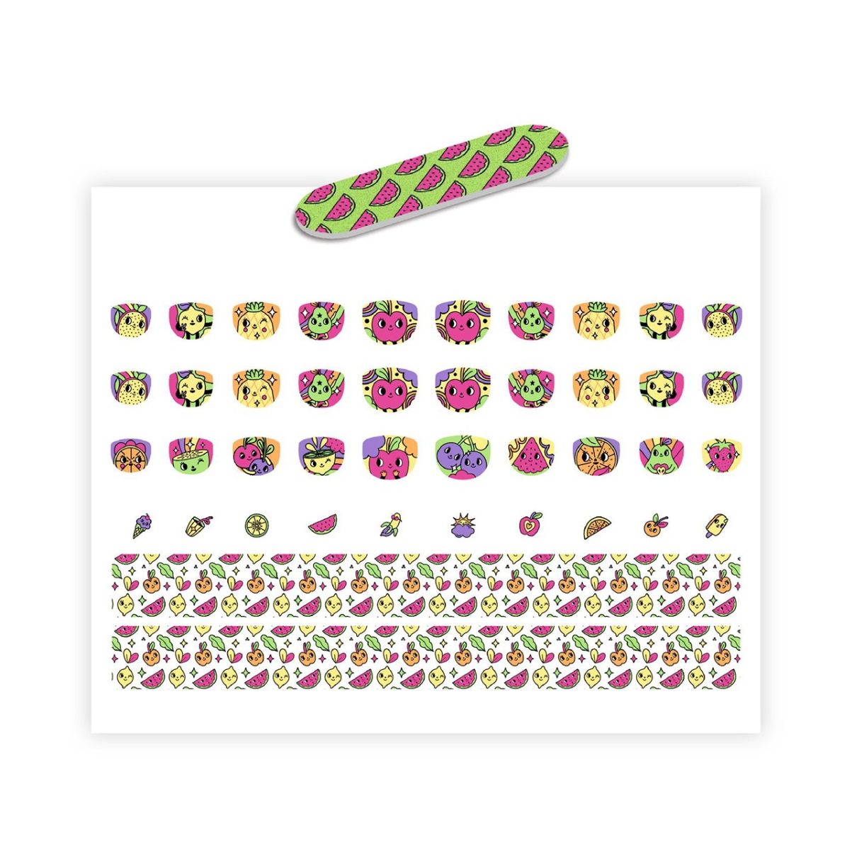 Най-накрая, супер бърз маникюр за малки деца, който е лесен за поставяне и сваляне! От най-малкия стикер за малкия пръст до най-големия за палеца: залепете, натиснете и готово! Няма лак за нокти, който да се надраска - само радостта да украсите ноктите си с красиви илюстрации! А за да смените моделите или да създадете свой собствен стикер, отрежете парче от самозалепващата се лента с размера на ширината на нокътя си.