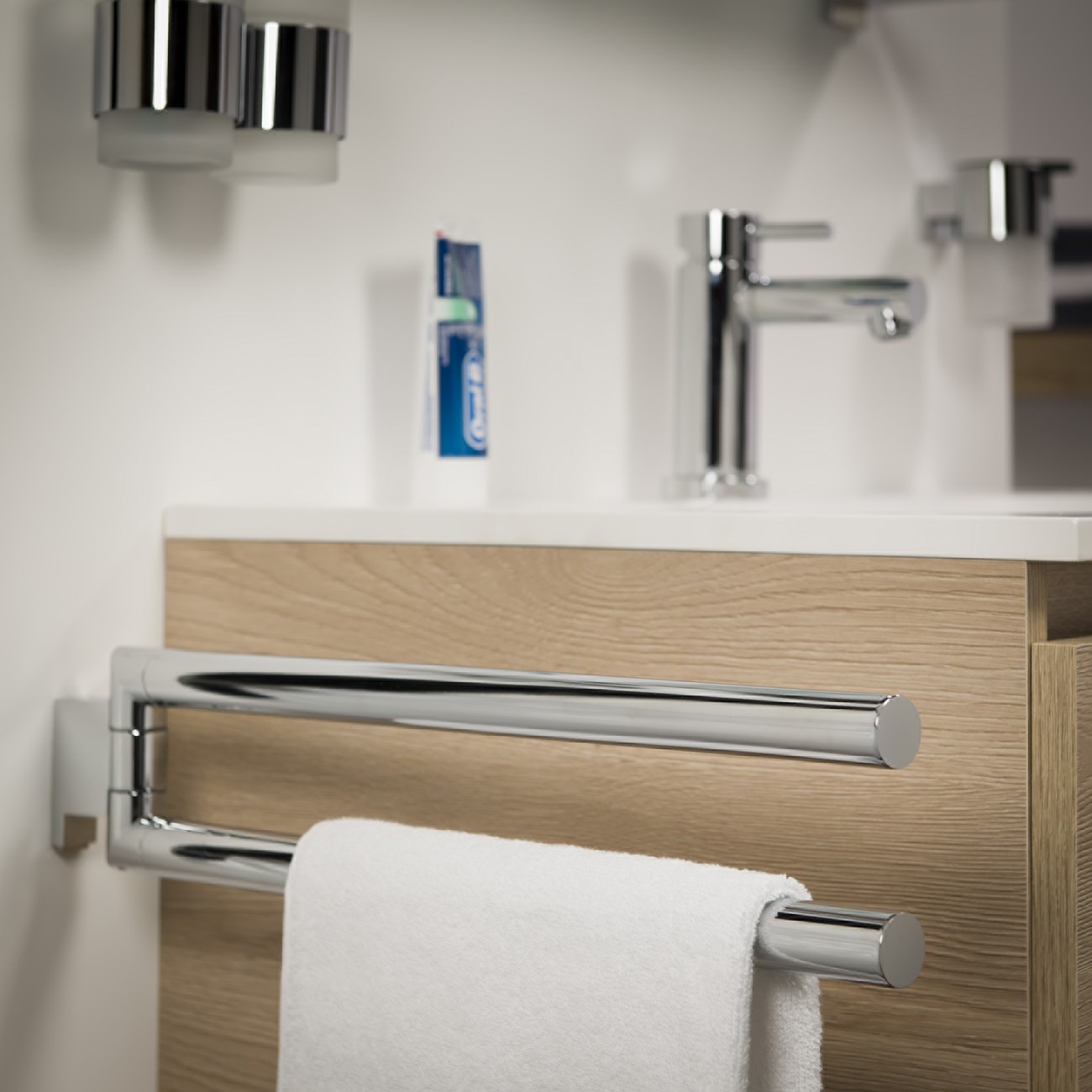 Елегантна закачалка за баня тип ножица, изработена от стомана. Цвят полирана хром. Подходяща за употреба във влажна среда. Изчистен дизайн и функционалост.