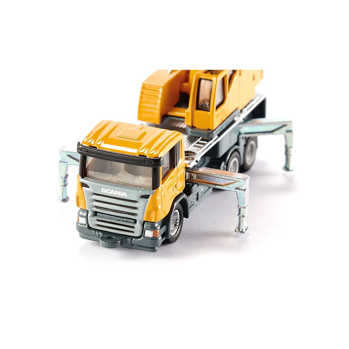 Маневрен и гъвкав камион с кран на 3-осно шаси с шофьорска кабина Scania. Кабината на водача и въртящото се тяло на крана са изработени от метал. Подвижното рамо на крана е лесно телескопично и 4-те опори могат да се разгъват. Моделът се движи на плавно движещи се колела с гумирани гуми. Куката на крана е изработена от метал и може да се повдига и спуска с помощта на въртящ се лост.