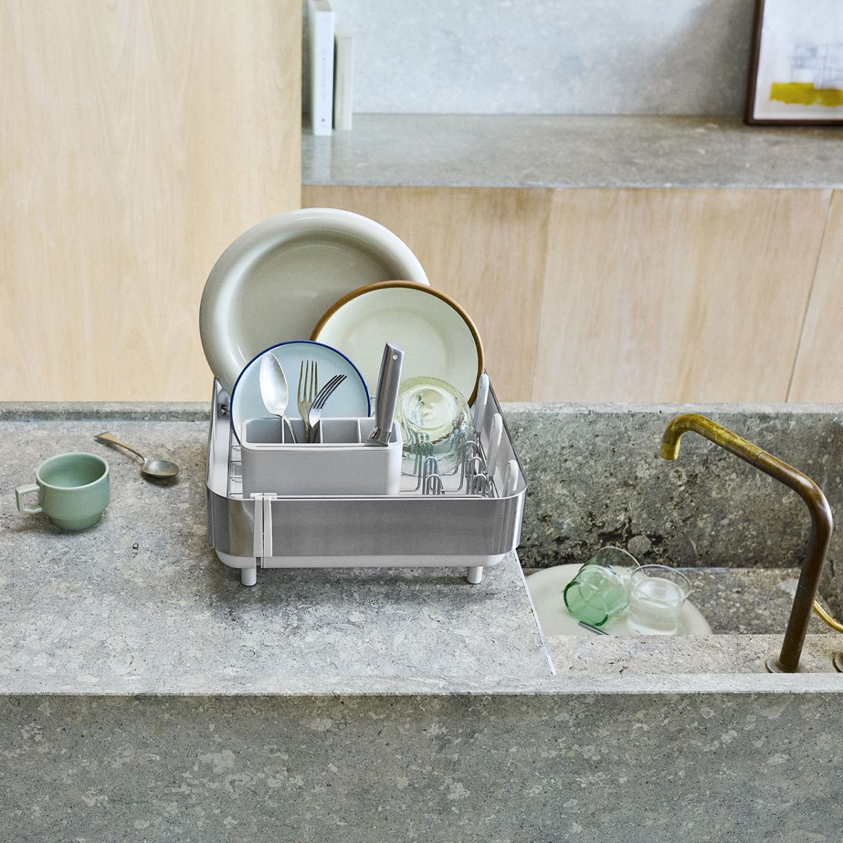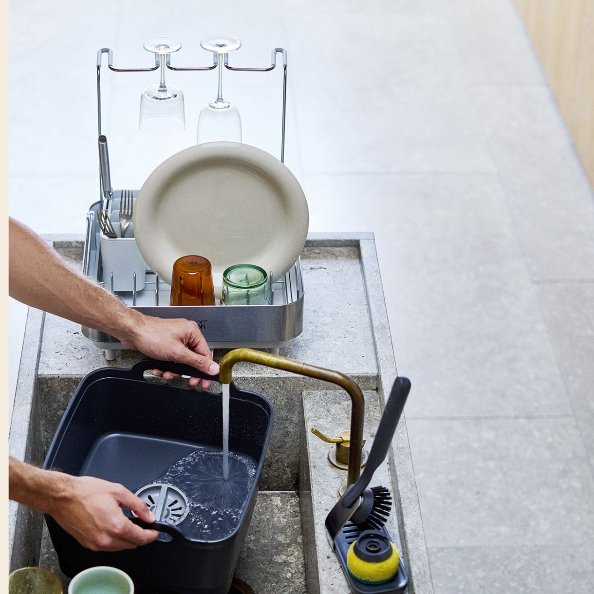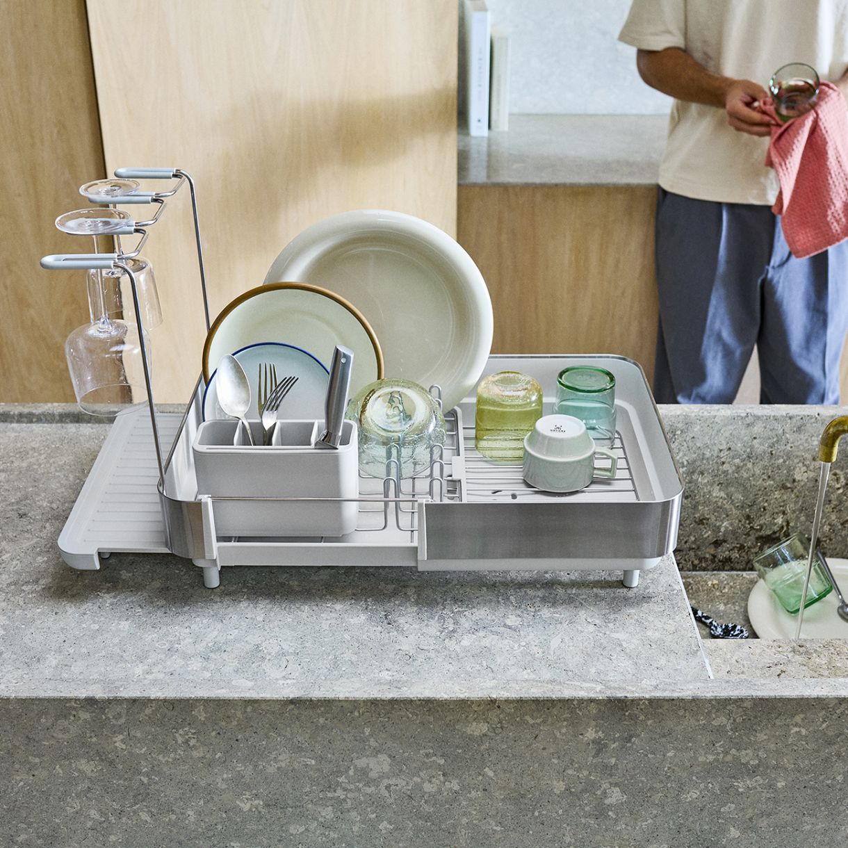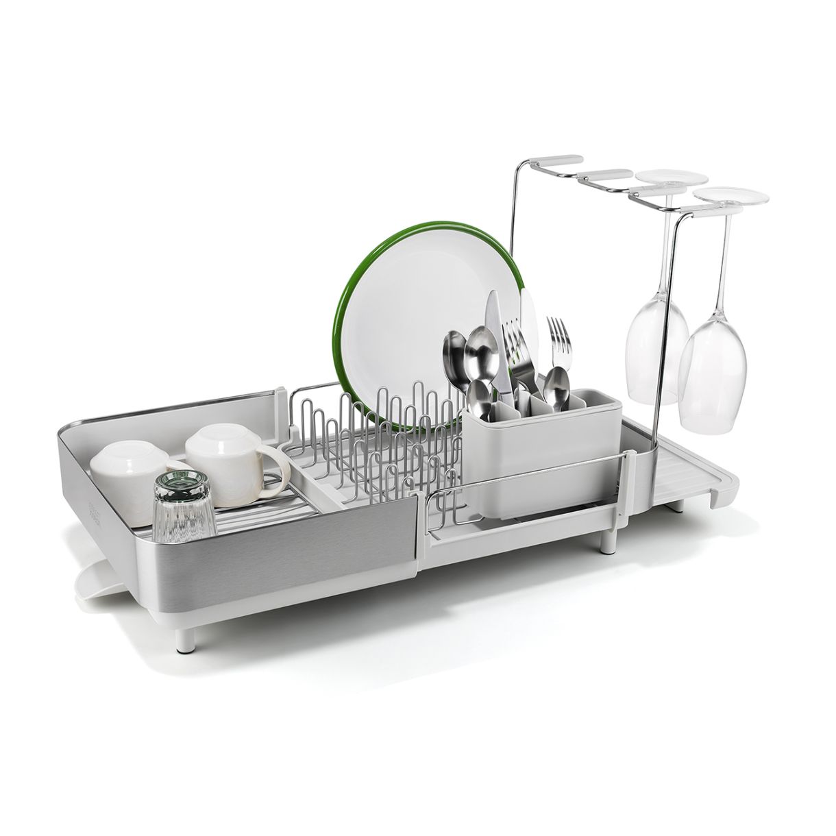 Интелигентният сушилник  Extend™ Plus на Joseph Joseph се разширява до два пъти размера си. Разполага с релса за чаши за вино, която държи чашите далеч от стойката за оптимално оттичане и безопасност, която удобно се сгъва, за да служи като сушилник за бутилки, когато е необходимо. Подвижните вътрешни решетки улесняват почистването, а подвижен чучур за оттичане излива вода директно в мивката. Extend™ Plus няма да измие чиниите вместо вас, но смятаме, че е следващото най-добро нещо.