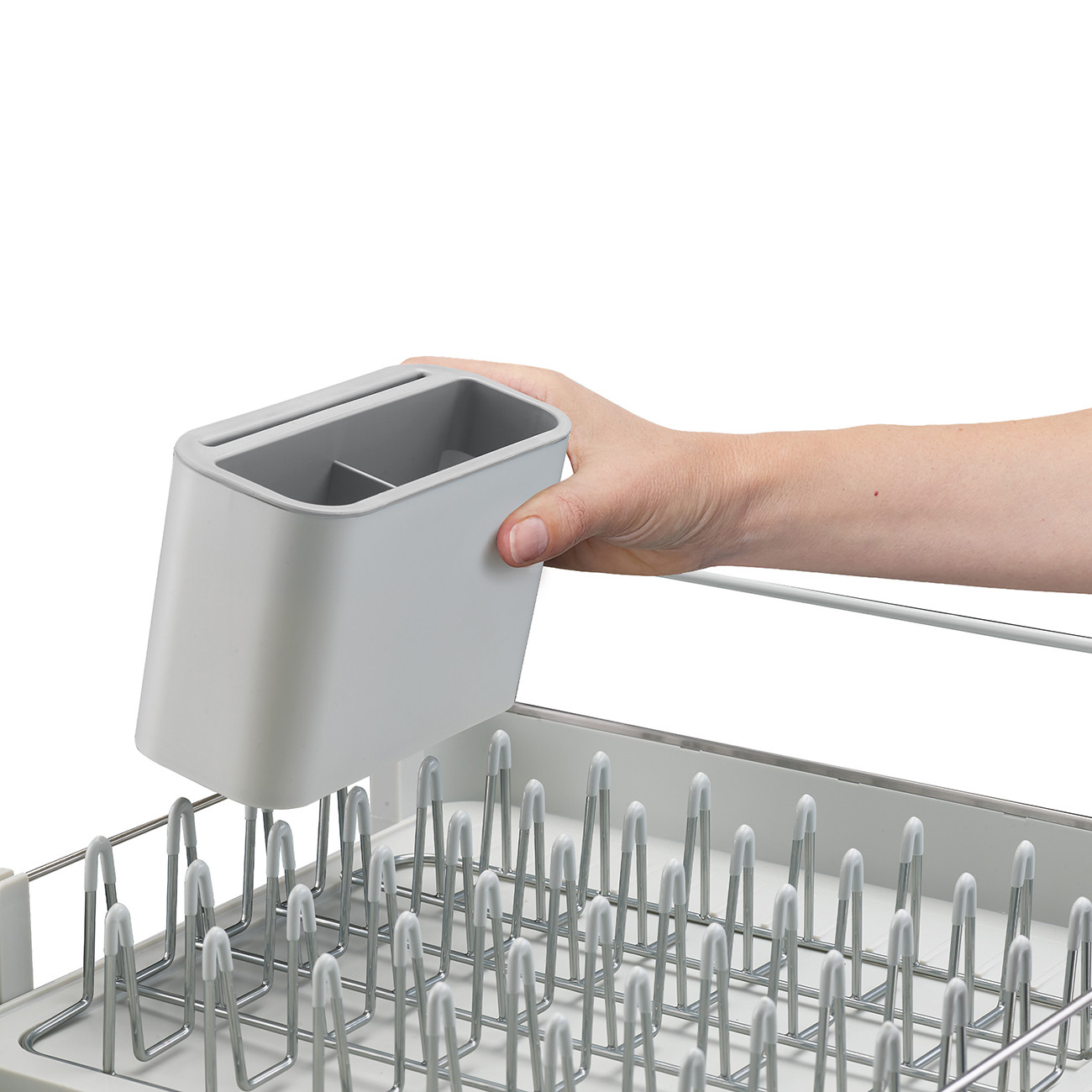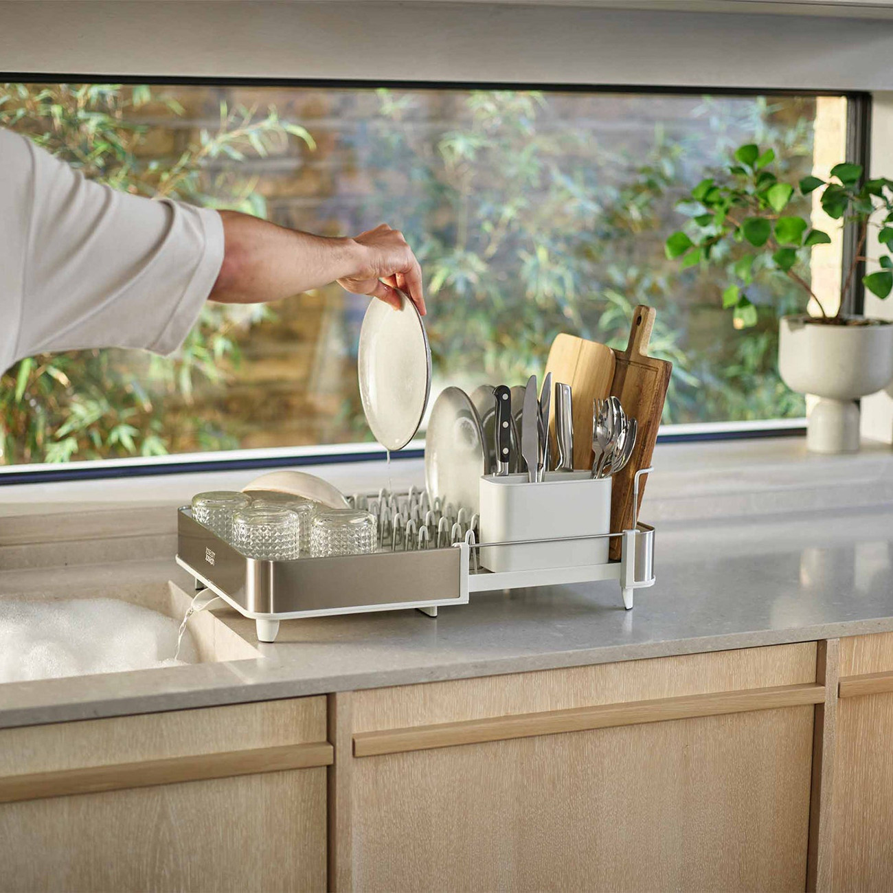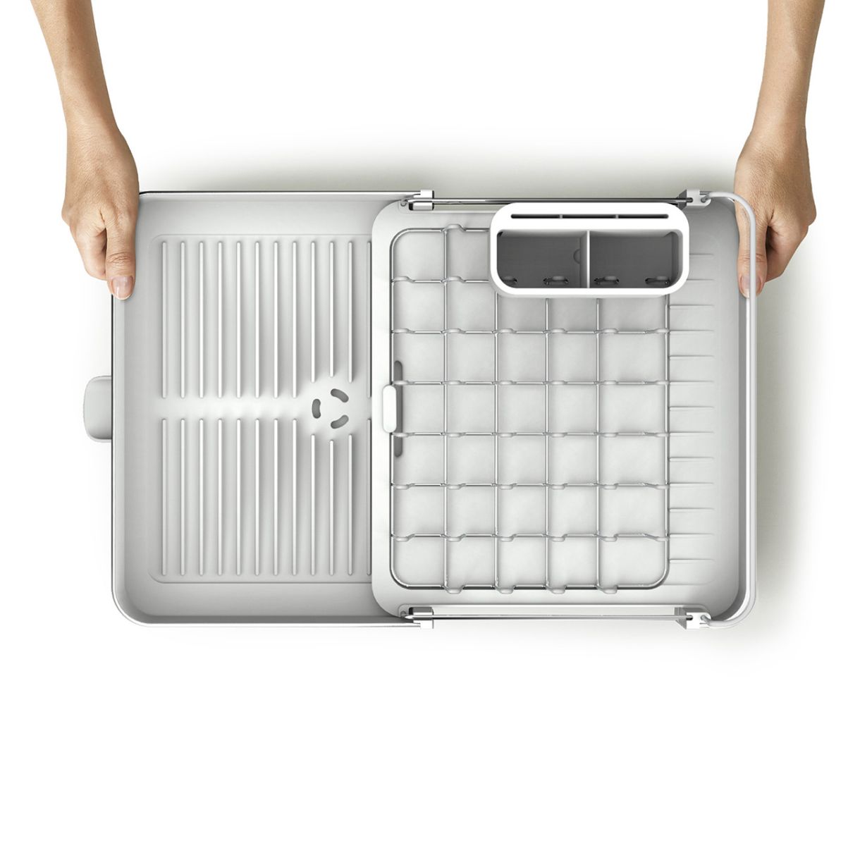Този интелигентен сушилник на Joseph Joseph разполага с плъзгаща се основа от 2 части, която ви позволява лесно да регулирате размера на пространство, когато имате нужда от повече място. Ребрата в основата помагат да се оттича излишната вода. Подвижната секция за прибори за хранене разполага с прорези за остри ножове, а здравата релса отзад помага за подкрепа на дъски за рязане или по-големи предмети.