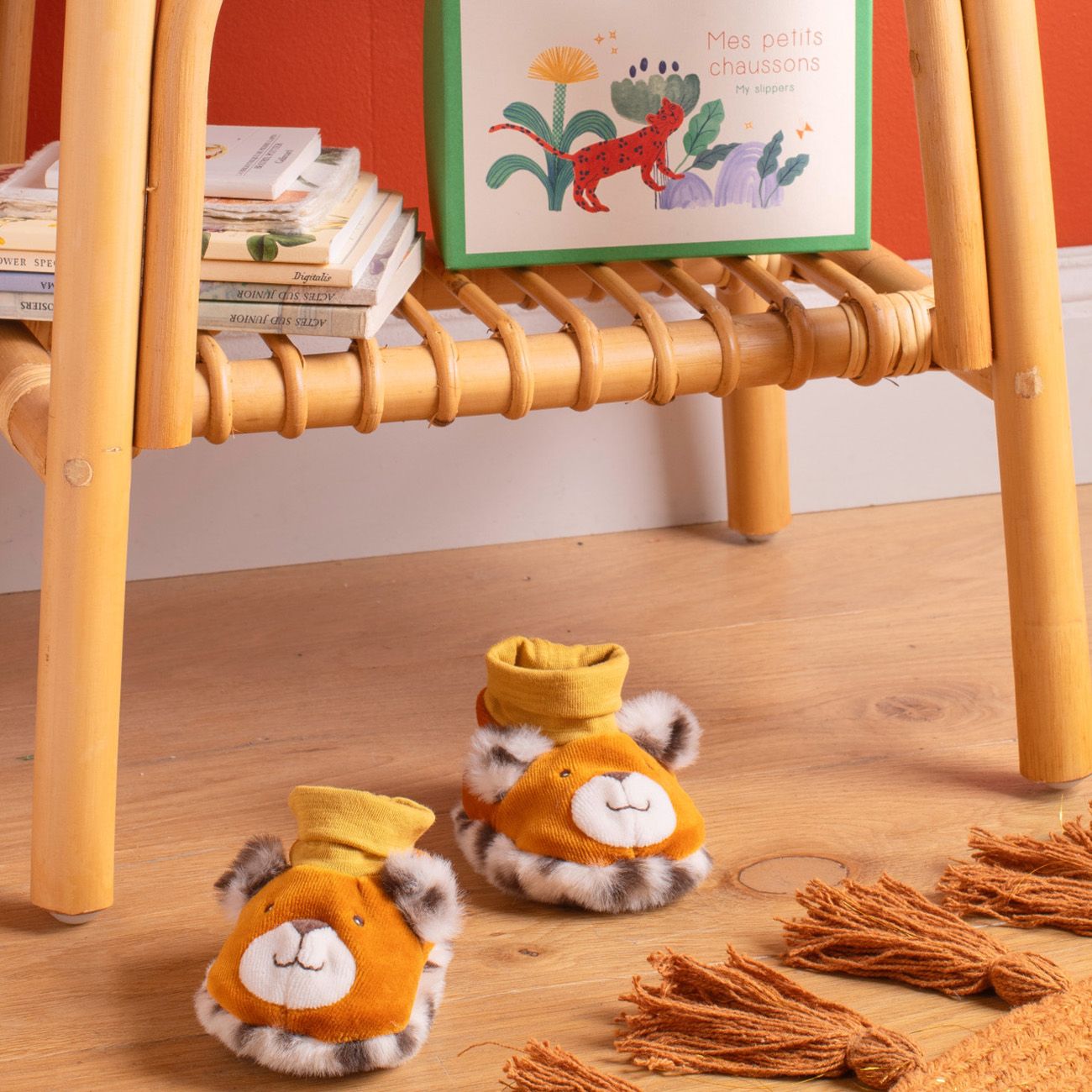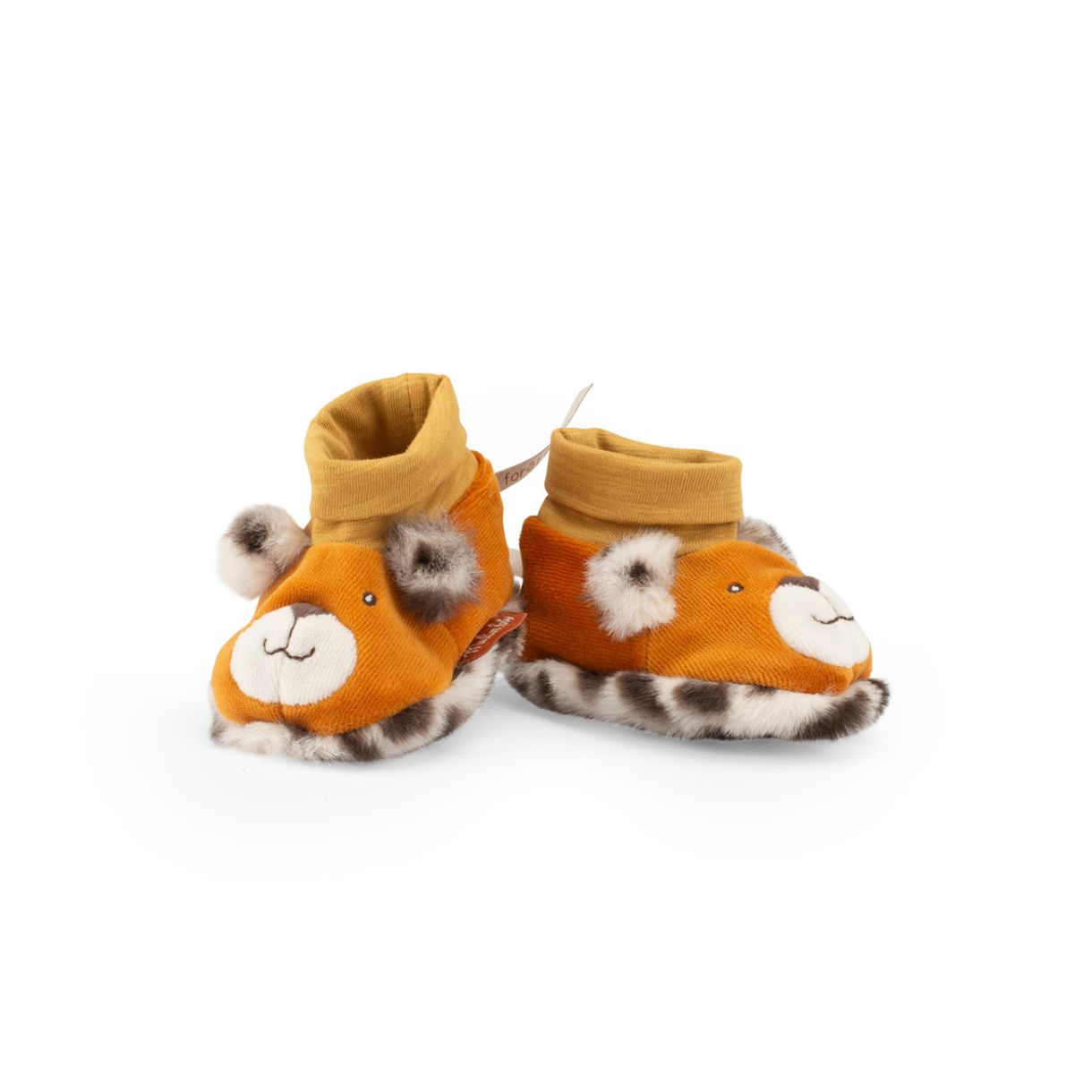 Очарователните бебешки пантофки Тайго от колекцията гората Мава на Moulin Roty са създадени, за да осигурят топлина, комфорт и много усмивки още от първите месеци. Изработени от мек кафяв велур с подметка от петниста пухкава материя, тези пантофки нежно поддържат крачетата на бебето приятно топли. Симпатичната леопардова муцунка превръща всеки момент в още по-сладък и забавен.Пантофките са предназначени за бебета от 0 до 6 месеца и се предлагат в красива подаръчна кутия, илюстрирана с акварели от Élodie Coudray – идеален избор за стилен и оригинален подарък за раждане.