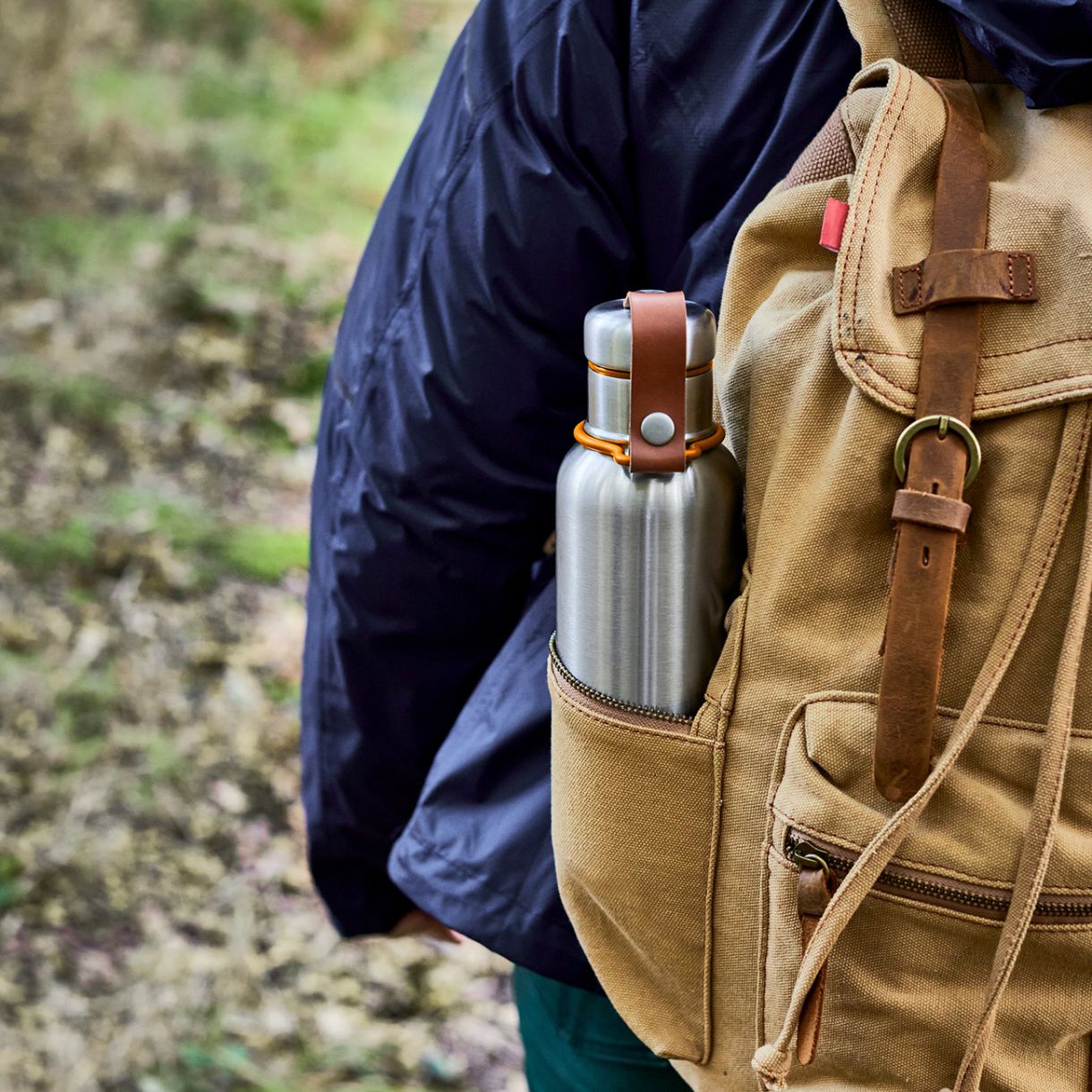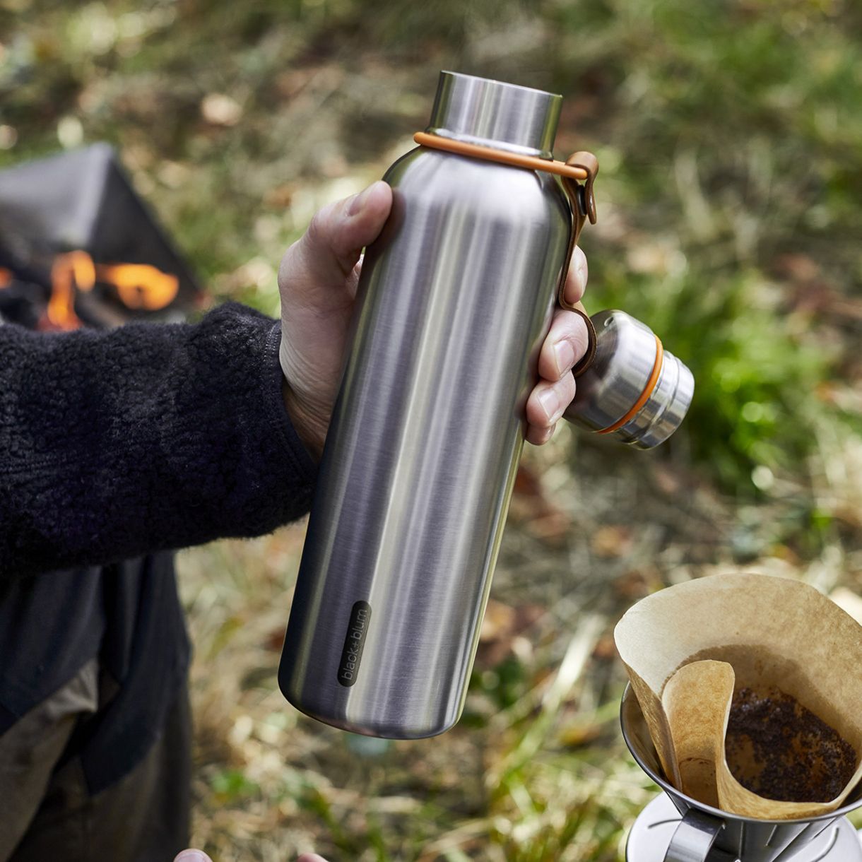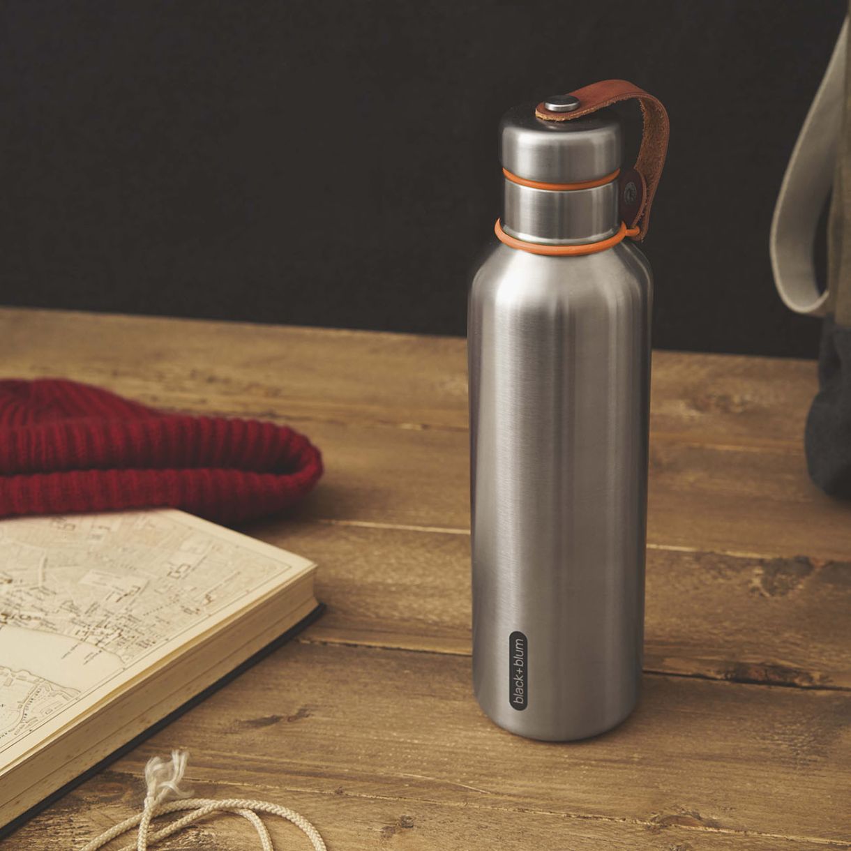 Тази двустенна бутилка ще поддържа напитките студени за 24 часа или горещи за 12 часа. Изработена е от неръждаема стомана, силикон и изкуствена кожа от английската компания Black+Blum.