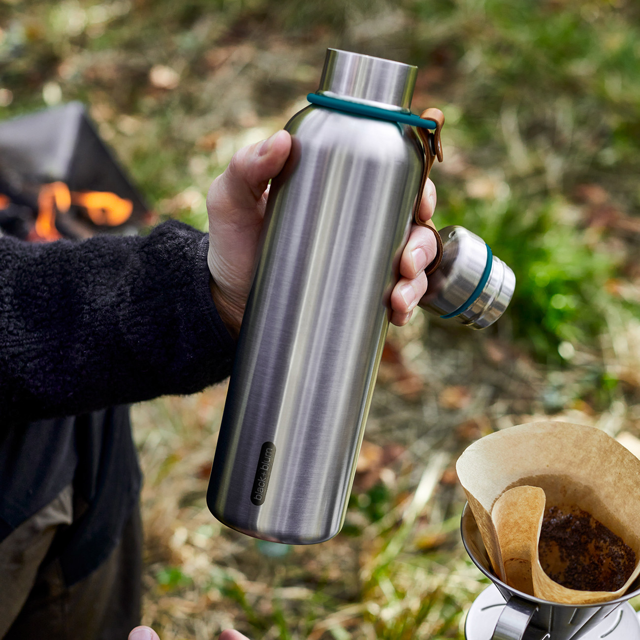 Тази двустенна бутилка ще поддържа напитките студени за 24 часа или горещи за 12 часа. Изработена е от неръждаема стомана, силикон и изкуствена кожа от английската компания Black+Blum.