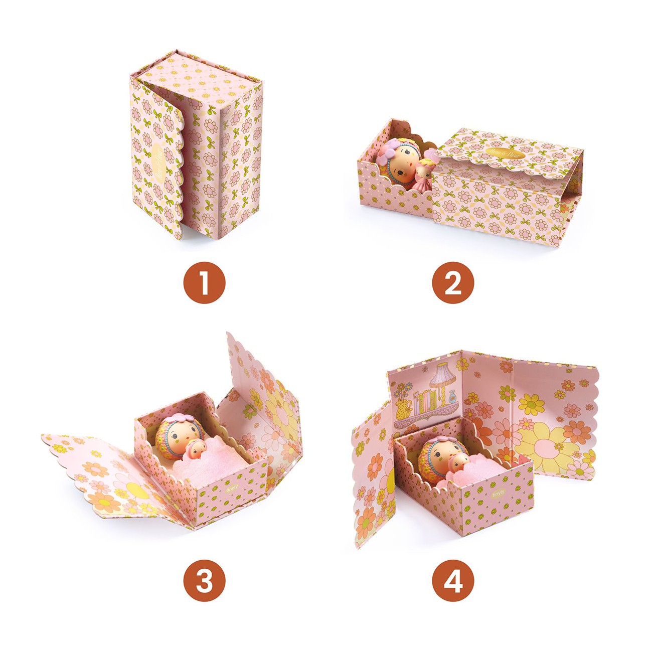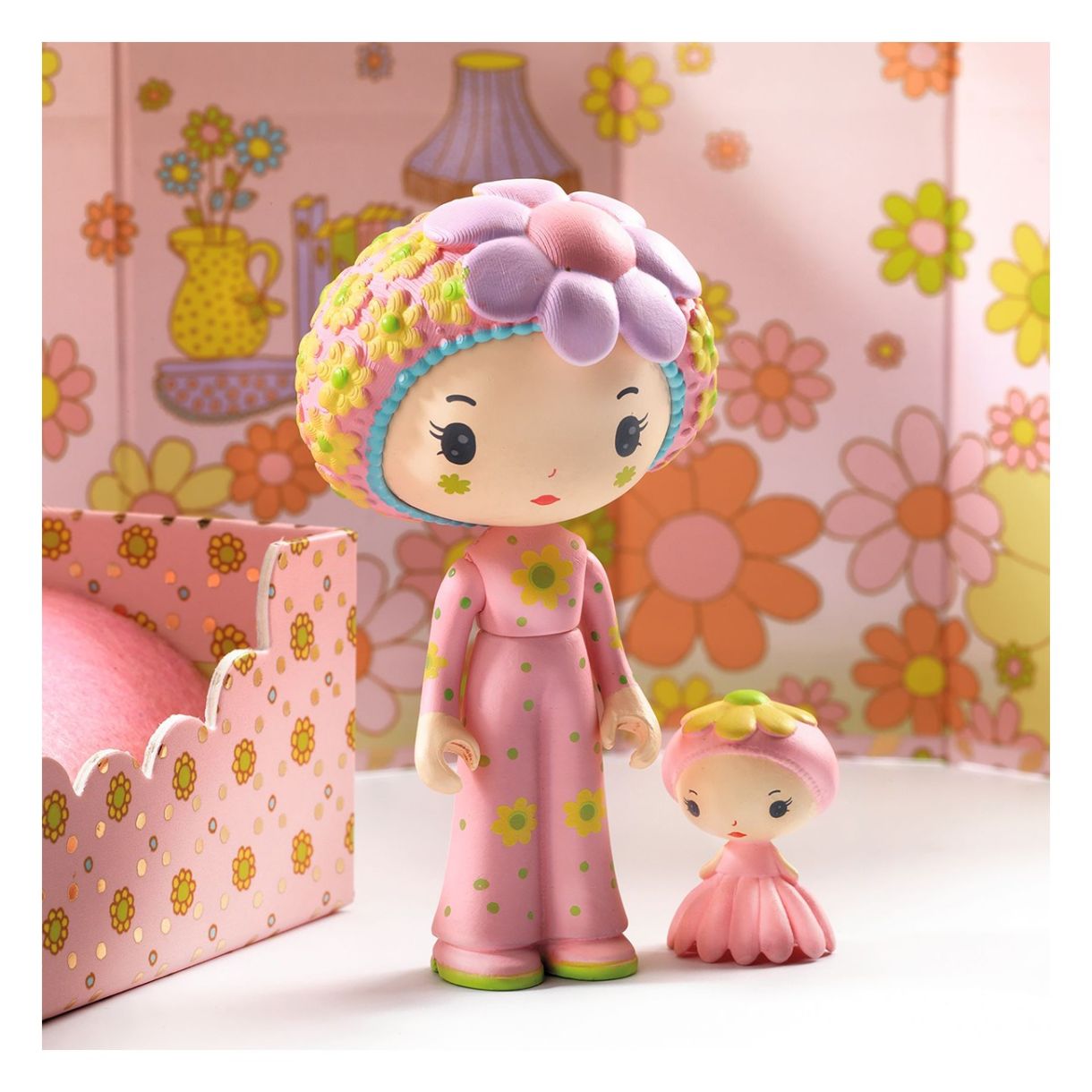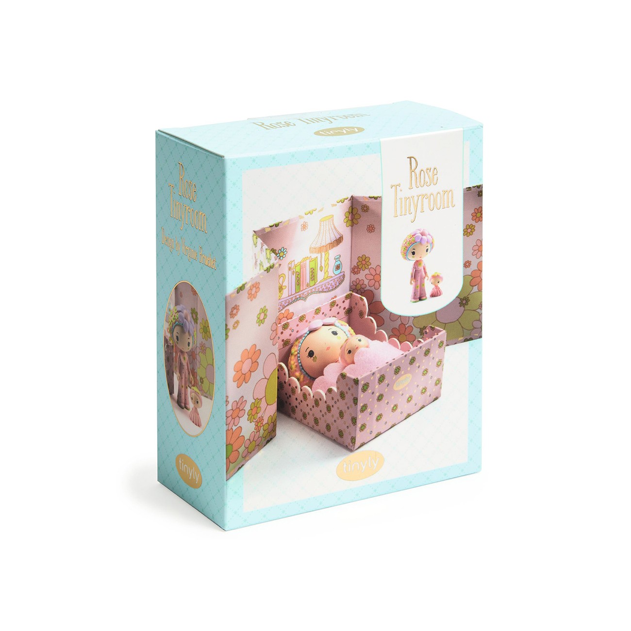 Малката стая на Роуз и нейния неразделен спътник Фльор е очарователно миниатюрно жилищно пространство. Малката кутия се превръща в спалнята на Роуз. Прекрасен дизайн на спалнята и удобно малко легло, където фигурките могат да се сгушат под завивките. Този цветен свят, изпълнен със сладост и поетичен чар, предлага дизайн на спалня за кукли и допълва преносимите къщи Tinyly.