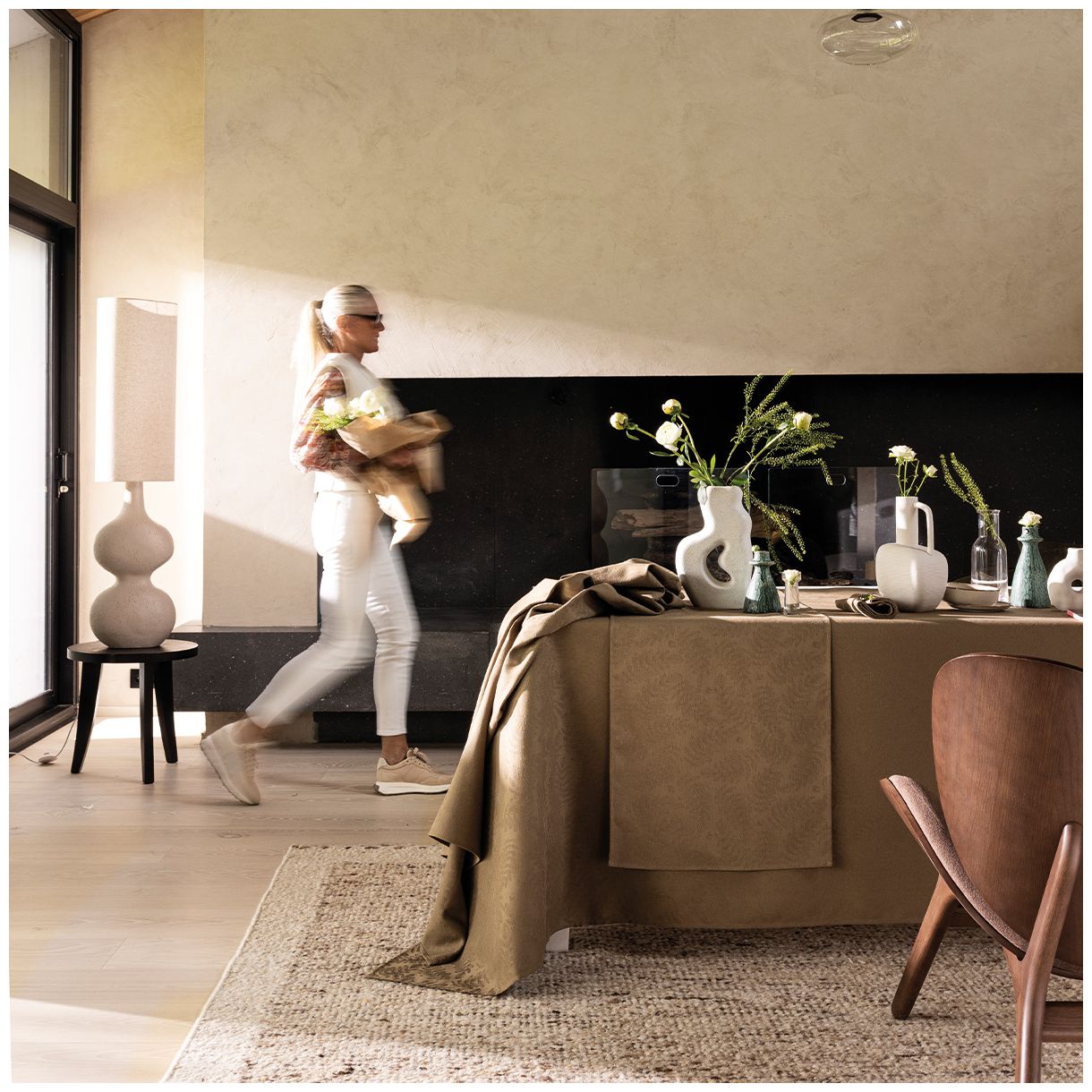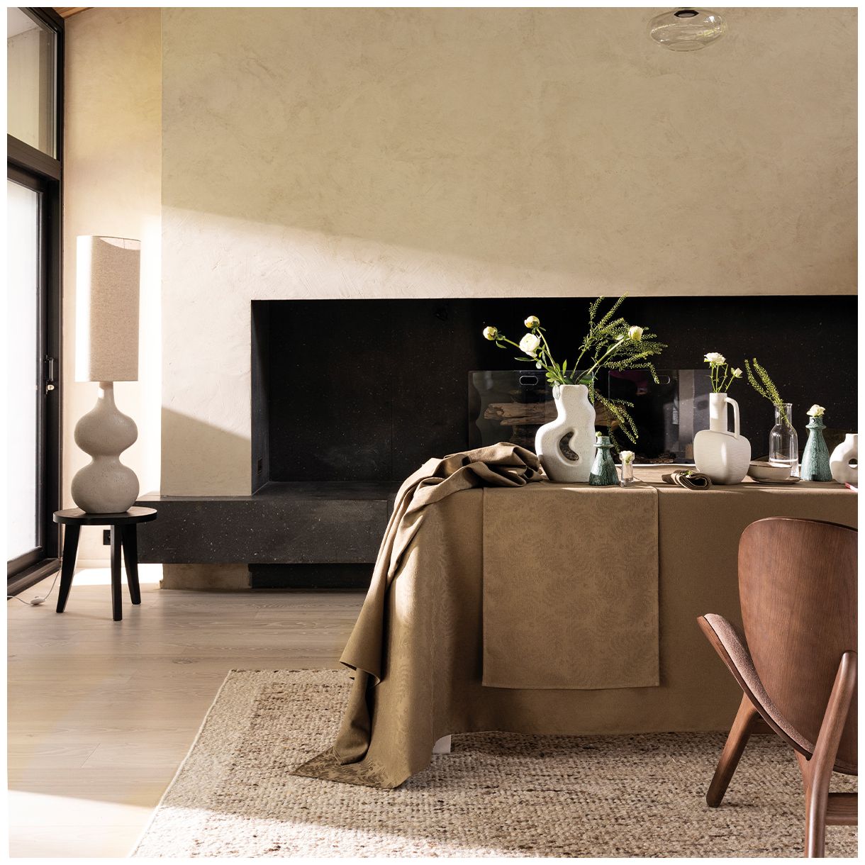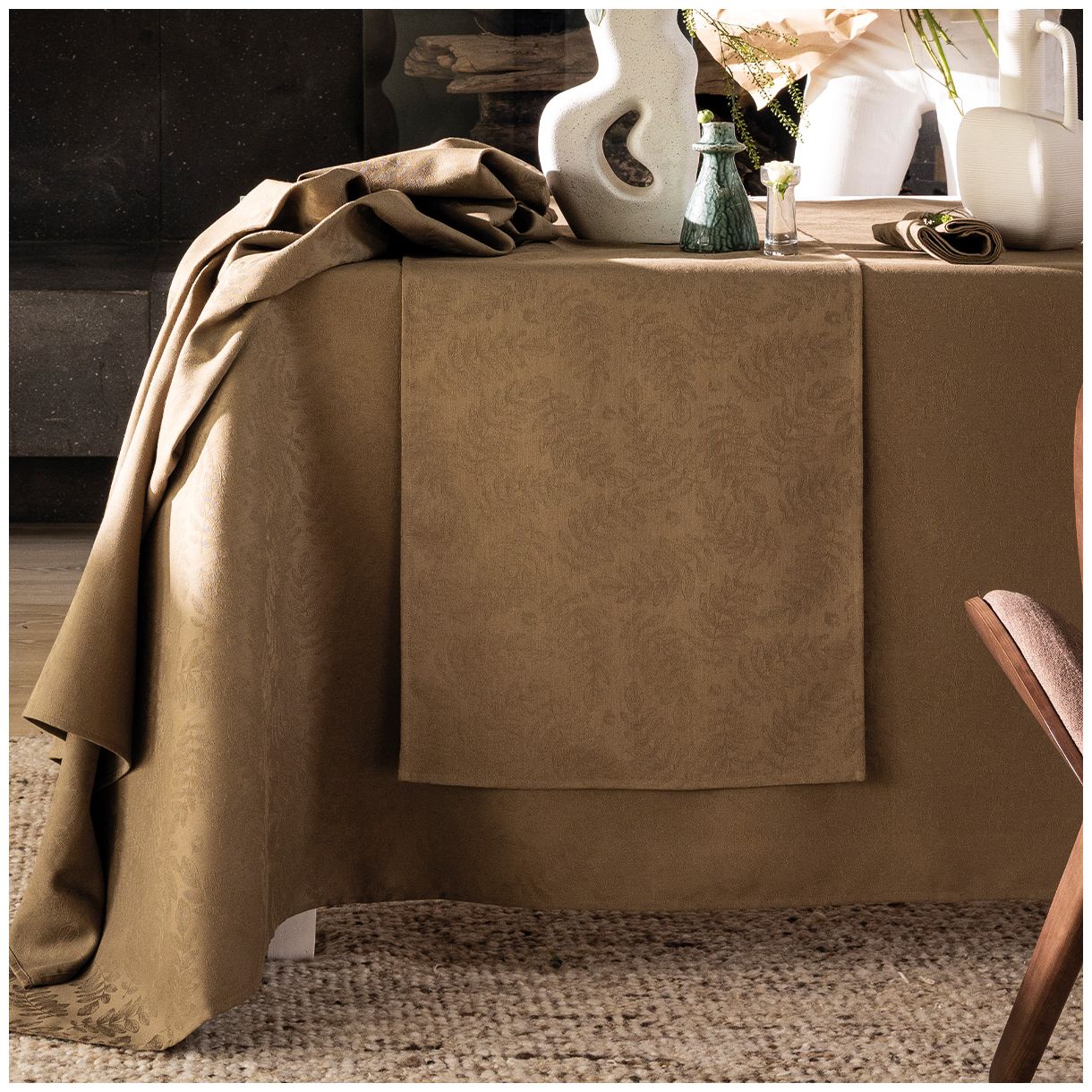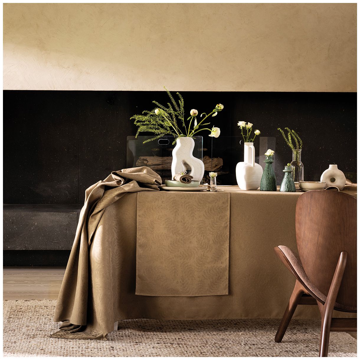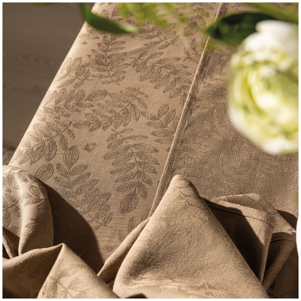 Потопете се в ботаническо бягство в сърцето на процъфтяващ дендрариум. Храсти, зеленина и нежни акациеви листа със сложни жилки красят това леко текстурирано платно. Тези флуидни и автентични шарки се съчетават с дълбоки нюанси за елегантна, модерна и спокойна маса.