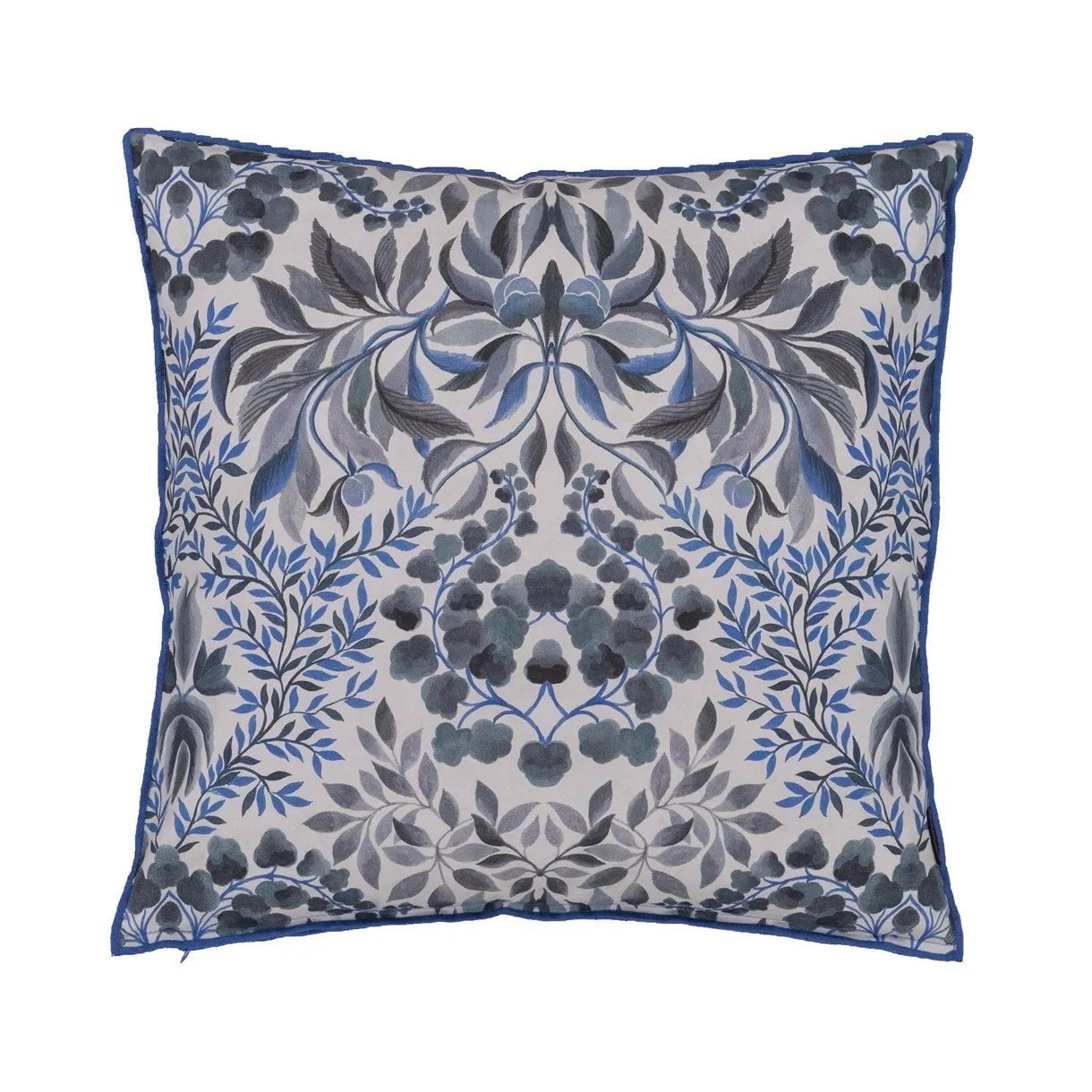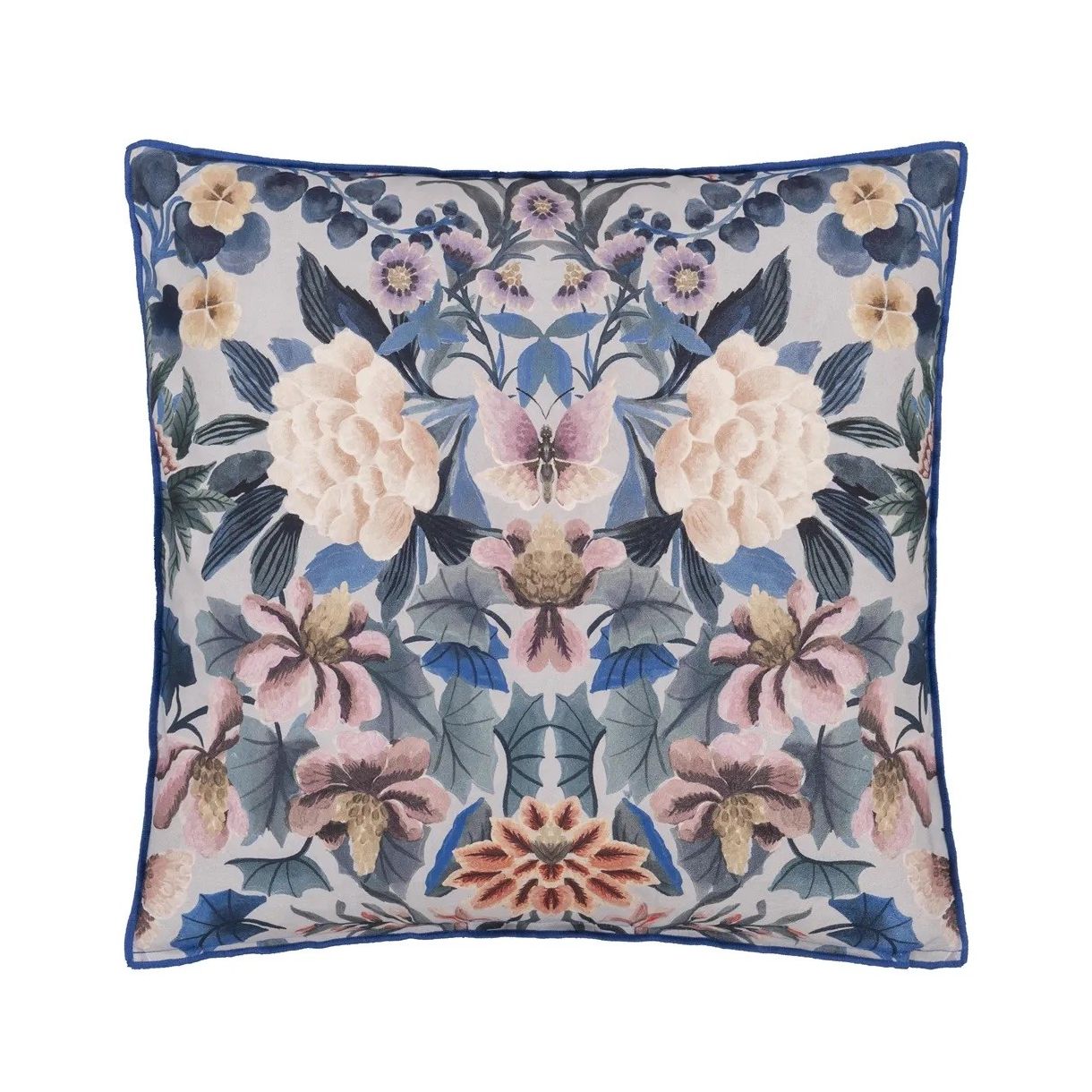 Изящни цветя, листа и пеперуди са подредени в изкусна калейдоскопична огледална форма. Декоративна квадратна възглавница с дигитален печат върху памук. Завършена с контрастен оверлог от всички страни.