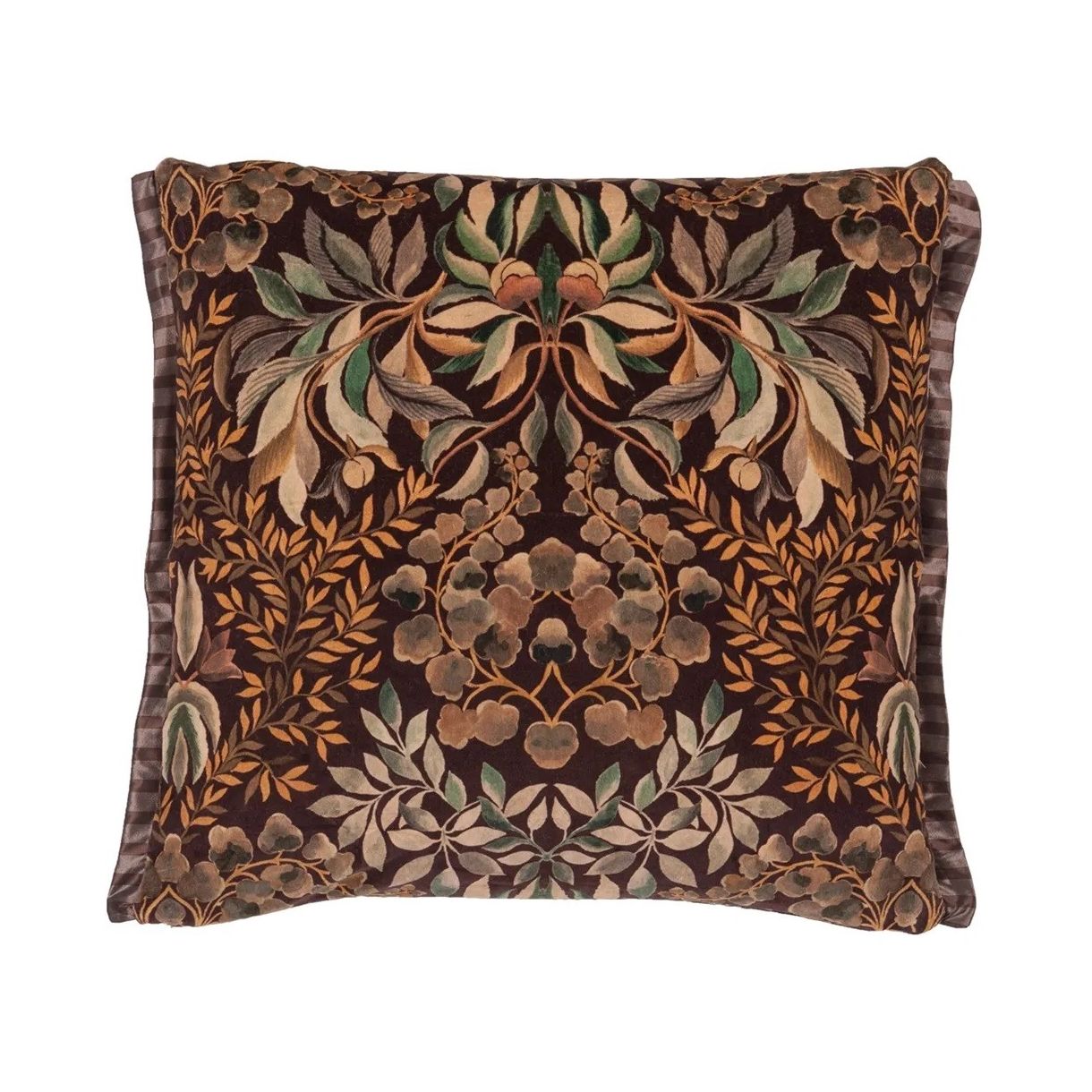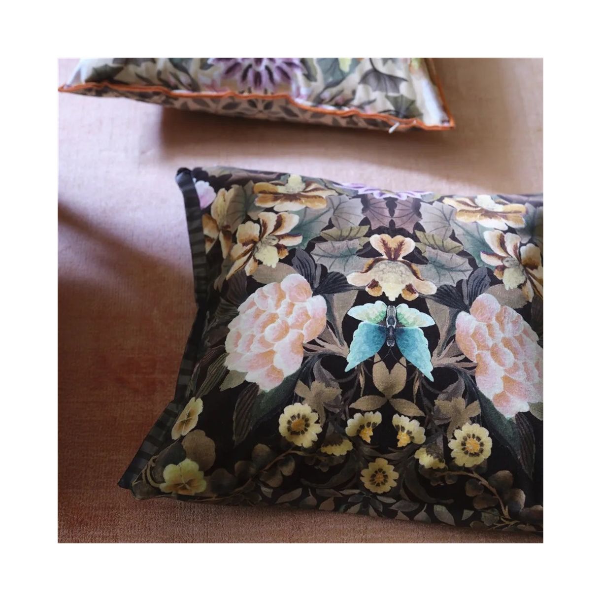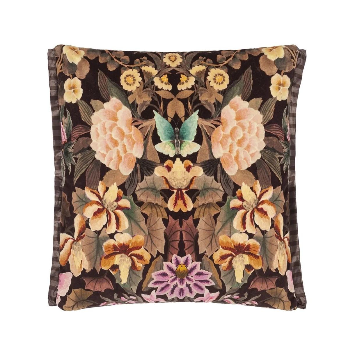 Изящни цветя, листа и пеперуди са подредени в изкусна калейдоскопична огледална форма. Декоративна квадратна възглавница с дигитален печат върху луксозно кадифе.